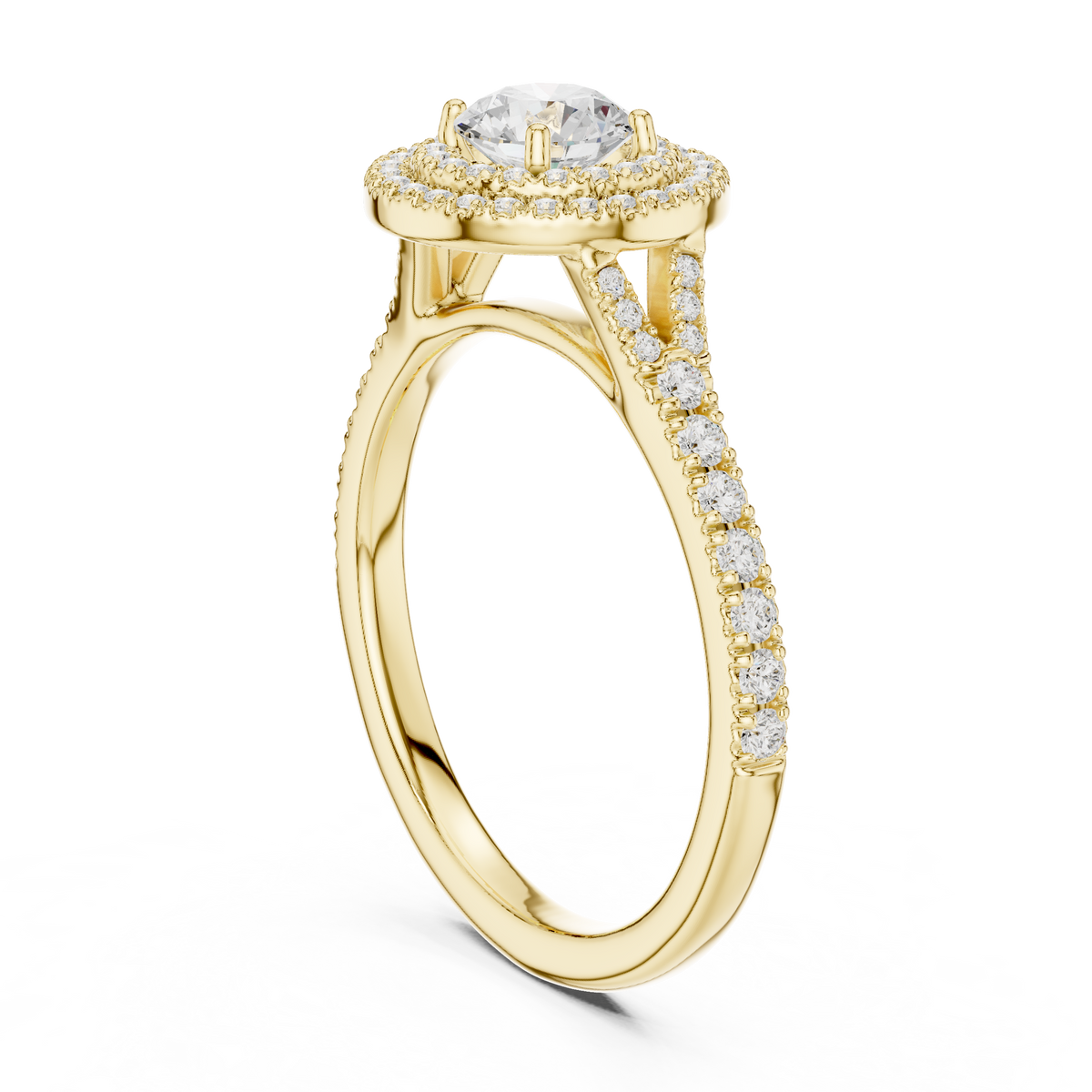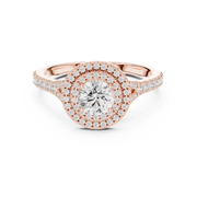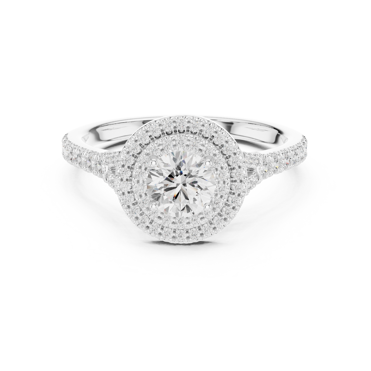 This elegant engagement ring showcases a dazzling round brilliant cut diamond at its center, framed by a radiant double halo of finely set round diamonds. The symmetrical cushion-inspired halo outline enhances the visual size and brilliance of the center stone, while a split shank band lined with pavé diamonds adds graceful dimension and continuous sparkle. Designed for maximum light reflection, the ring delivers exceptional fire, depth, and brilliance from every angle.