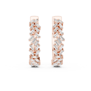 These statement huggie hoop earrings feature a bold chevron-inspired design highlighted by precisely arranged baguette cut diamonds. The structured geometric pattern creates dynamic visual movement while maintaining perfect symmetry. Set along the front face of the hoops, the diamonds deliver sharp brilliance and dimensional depth with a polished, high-end finish.