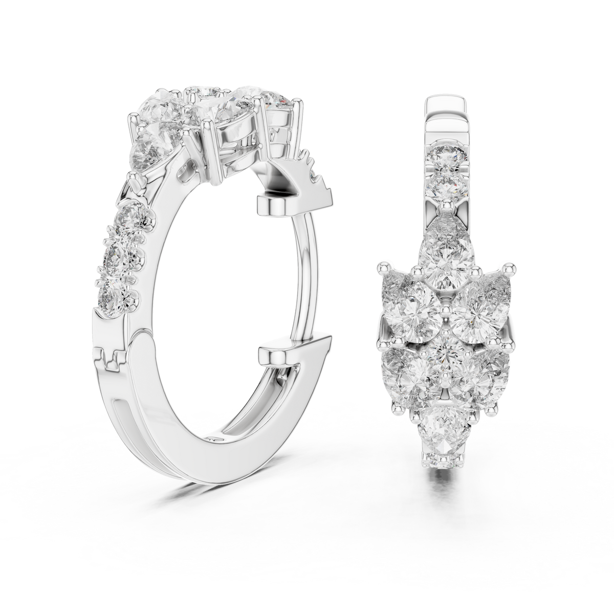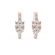 These refined huggie-style hoop earrings showcase a beautifully balanced floral cluster design crafted with pear and round cut diamonds. The structured silhouette offers graceful symmetry, while the layered stone arrangement enhances depth, brilliance, and a polished, high-jewelry finish.