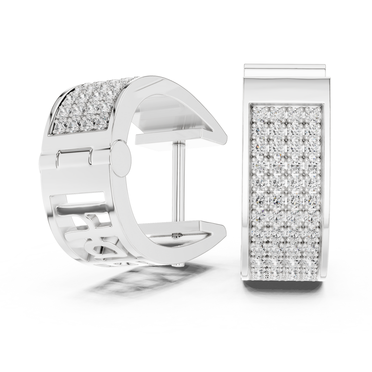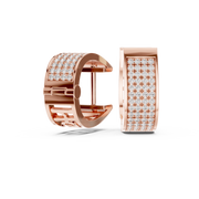These diamond hoop earrings showcase a bold yet refined huggie silhouette, crafted with a wide curved profile and meticulously arranged rows of round brilliant-cut diamonds. The surface is fully pavé set, creating continuous sparkle across the front face for maximum light reflection and visual depth. The structured symmetry and smooth inner contours offer a polished, sculptural finish that feels both modern and timeless.