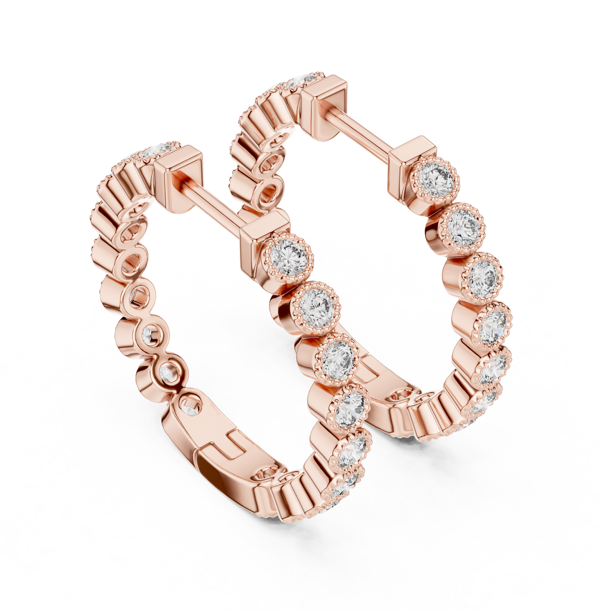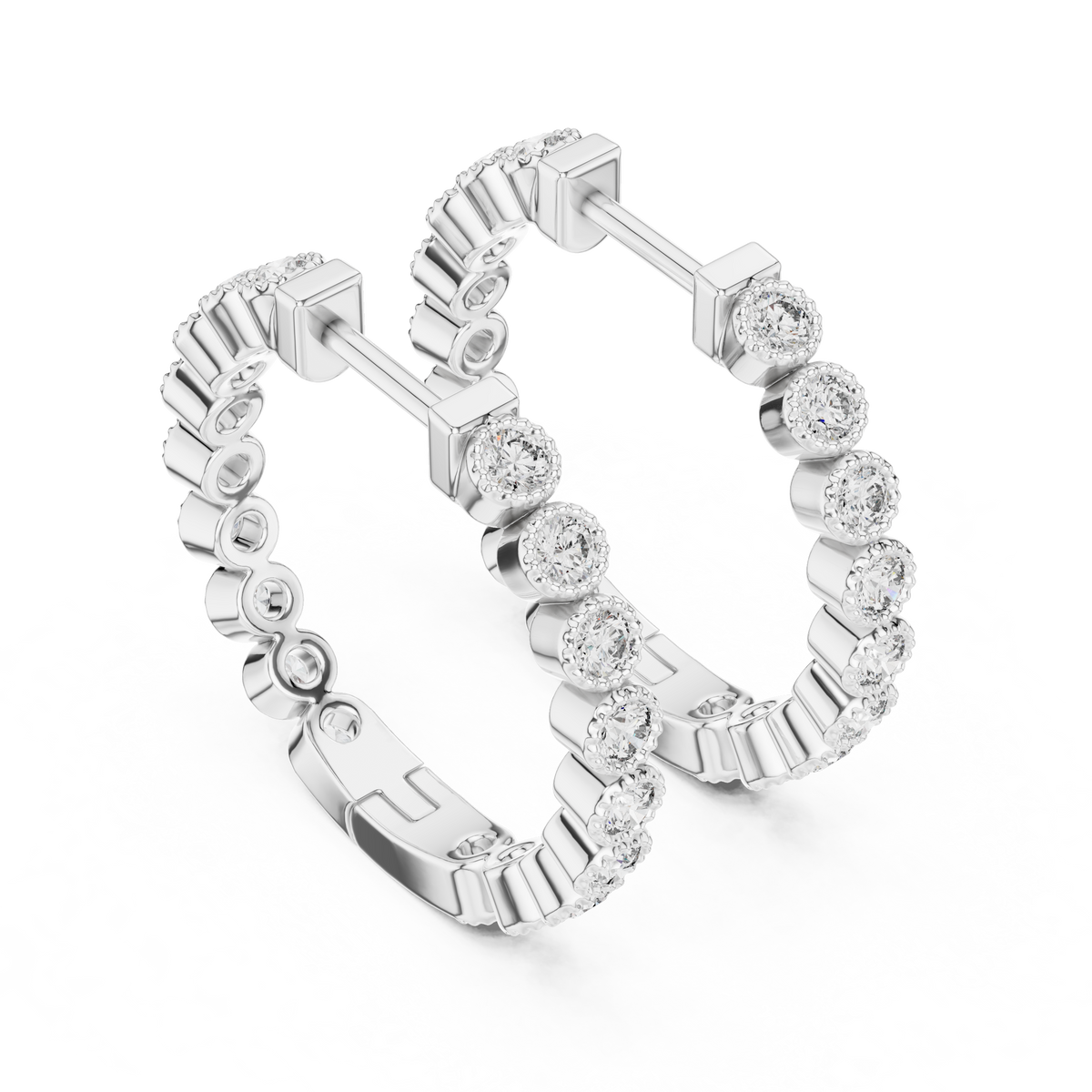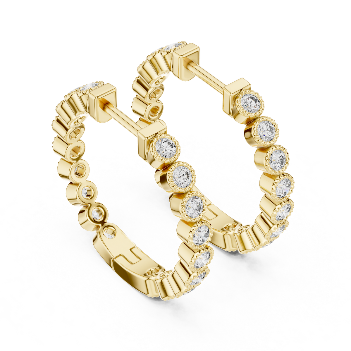 These refined huggie hoop earrings showcase a continuous row of round brilliant cut diamonds, each securely bezel set for a smooth, polished appearance. The uniform diamond placement creates elegant symmetry, while the compact hoop profile delivers a modern, streamlined silhouette. Designed to reflect light evenly, these earrings offer subtle depth and enduring brilliance.