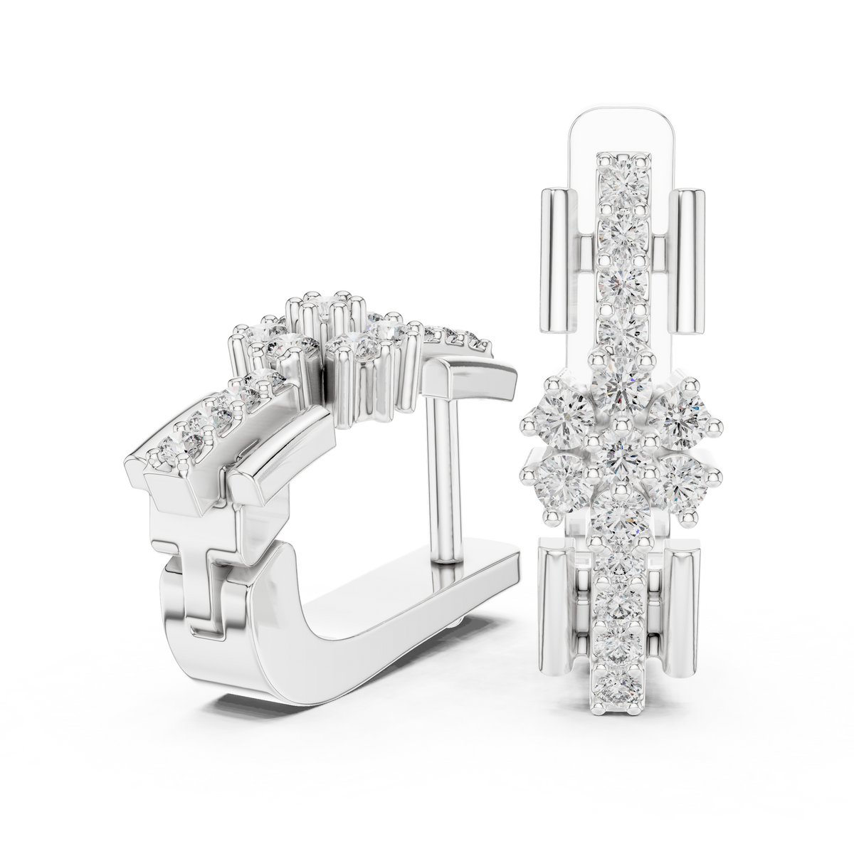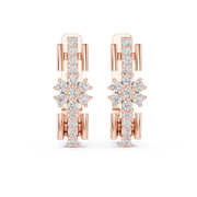 These diamond hoop earrings feature a sleek huggie silhouette accented by a radiant floral cluster centerpiece. A vertical row of round brilliant diamonds flows along the front bar, leading to a delicate flower-inspired arrangement that adds depth and graceful symmetry. The structured yet elegant design hugs the ear comfortably while delivering brilliant sparkle and a polished, contemporary finish.