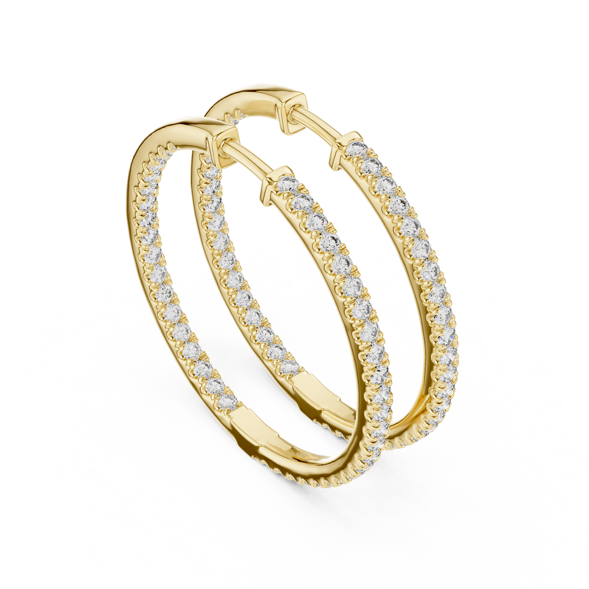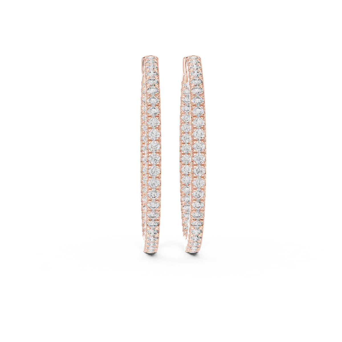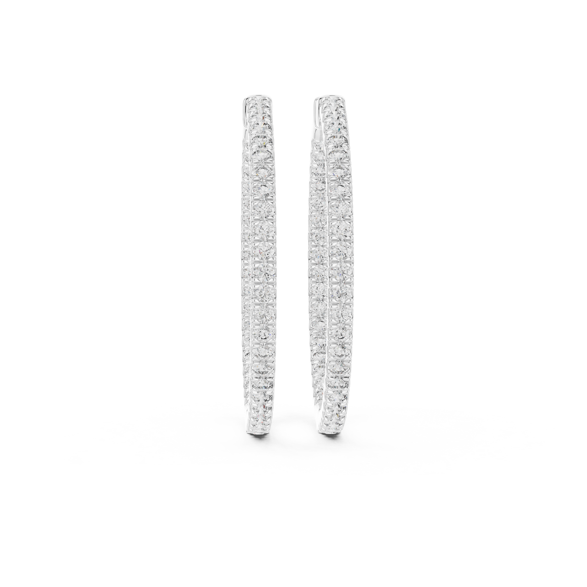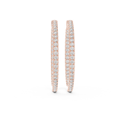 These diamond hoop earrings feature a sleek, slender silhouette designed with a full eternity line of round brilliant diamonds. Set in an inside-out style, the stones continue along the front and inner curve of each hoop, maximizing light reflection from every angle. The clean circular form and continuous sparkle create a timeless, balanced look that transitions effortlessly from day to evening wear.