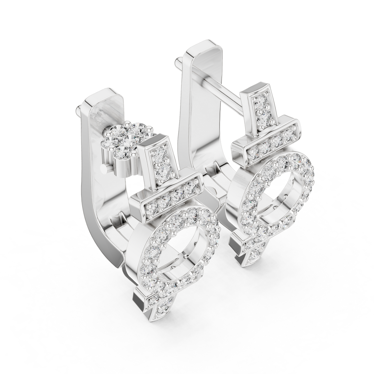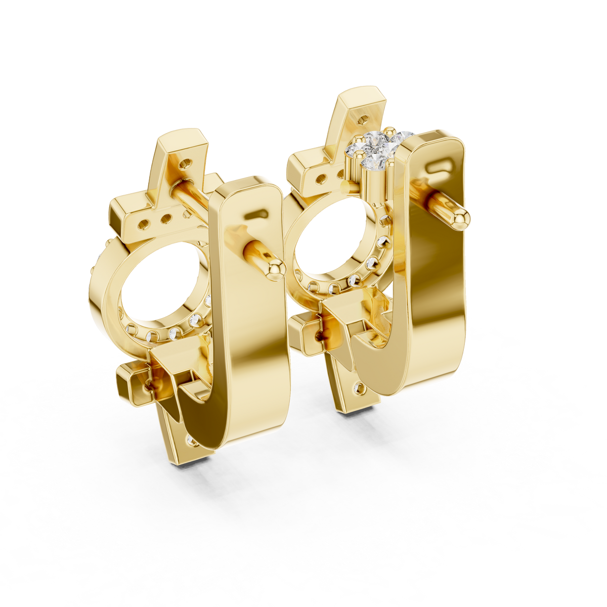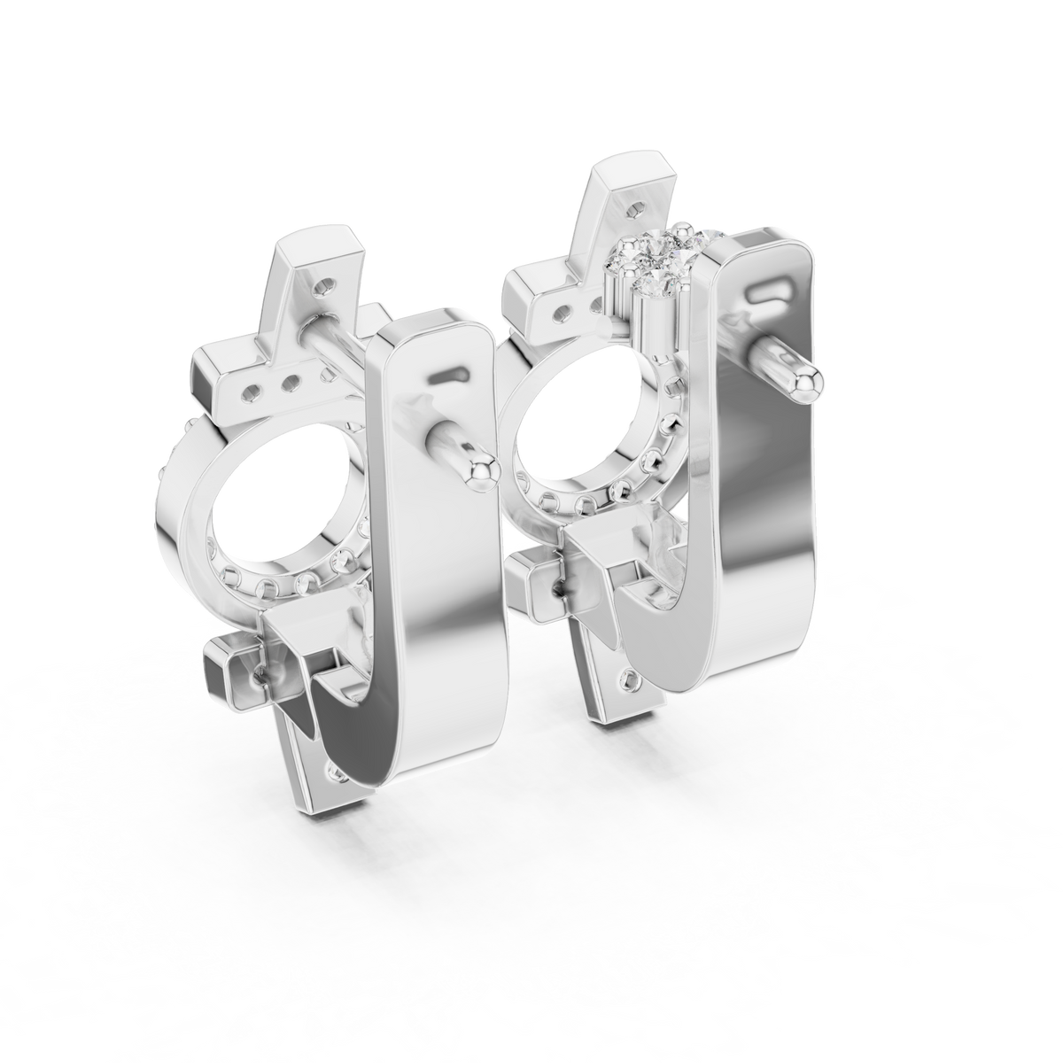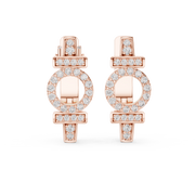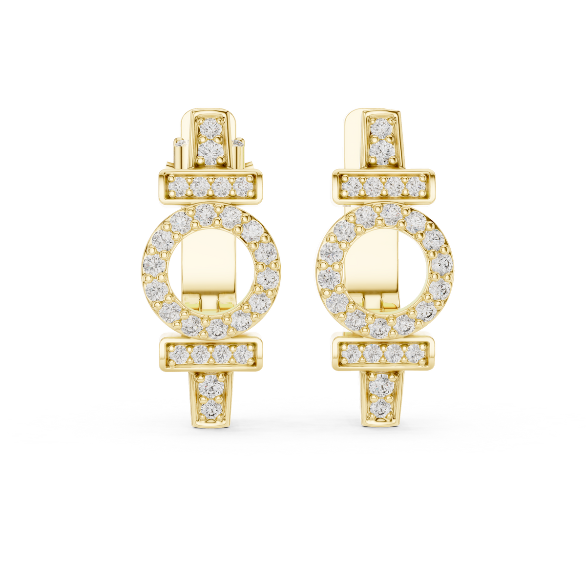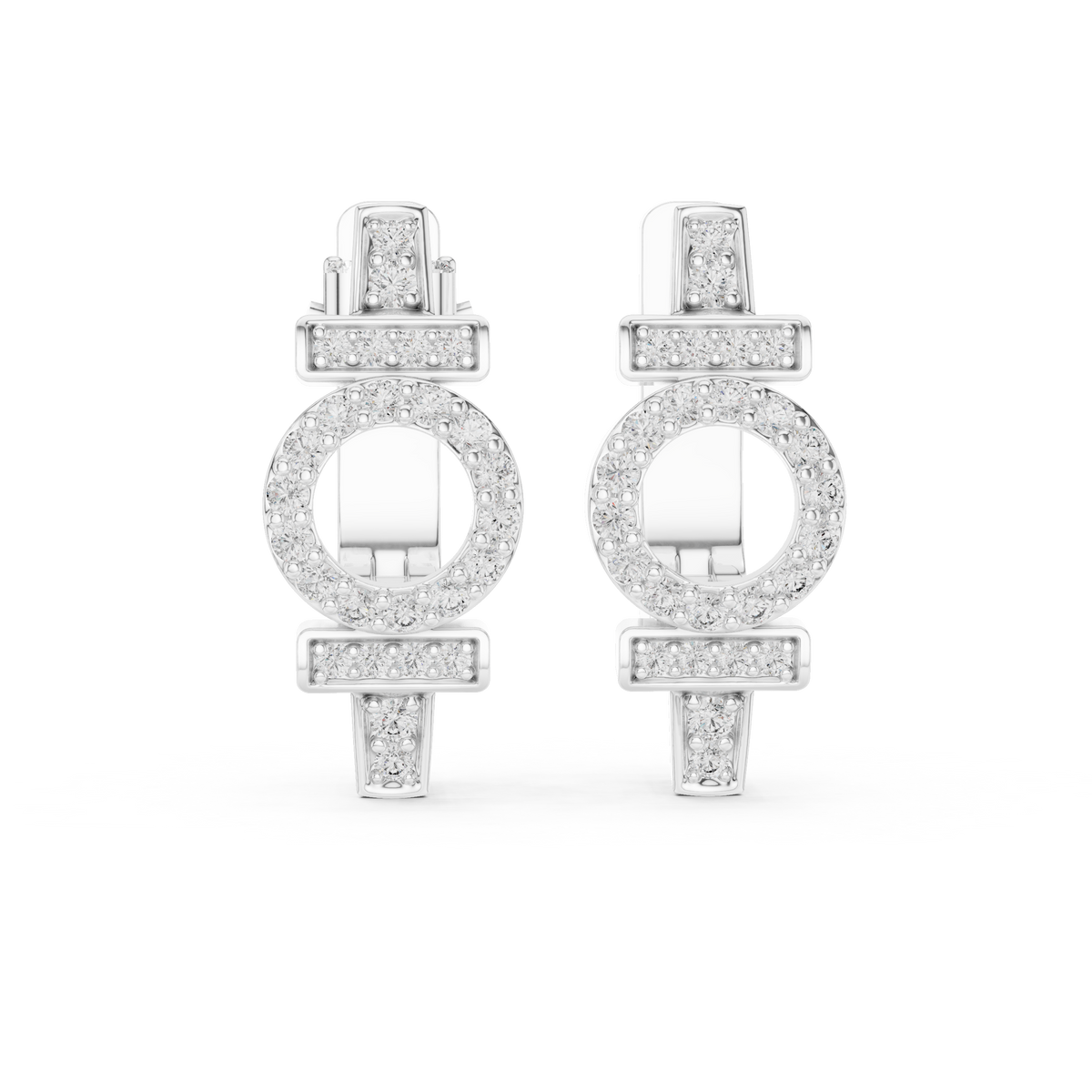 These diamond hoop earrings showcase a contemporary geometric design that blends clean bars with a central open circle silhouette. A refined huggie profile hugs the ear comfortably, while rows of round brilliant diamonds accent the vertical and horizontal elements for balanced sparkle. The structured form creates visual depth and symmetry, delivering a polished, modern aesthetic with timeless appeal.