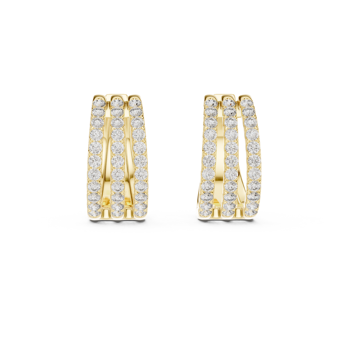 These hoops blend contemporary boldness with timeless elegance. The triple-row diamond layout creates a luxurious statement while the huggie style keeps them lightweight and secure for all-day wear. Perfect for both special occasions and everyday sophistication, they elevate any look with effortless brilliance.
