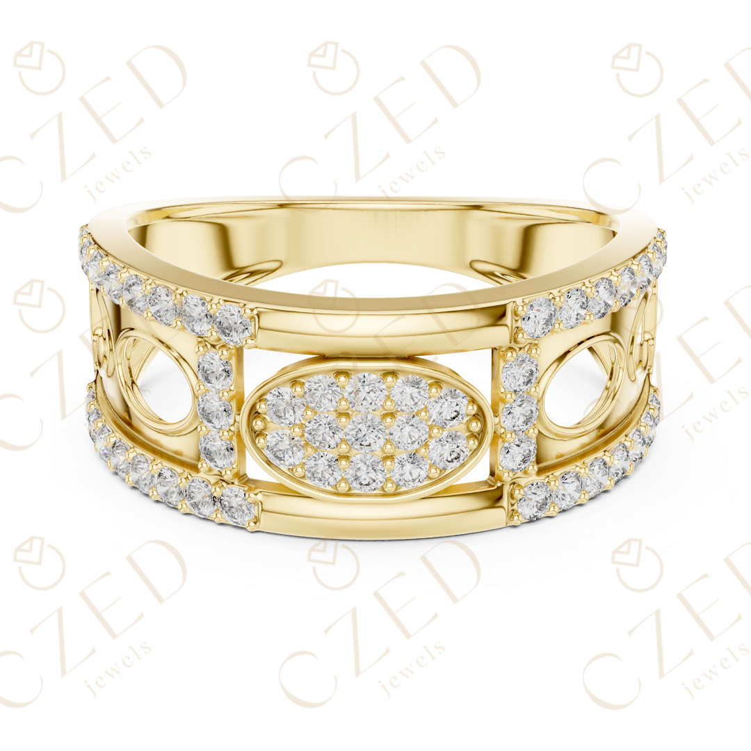This refined men’s band showcases a bold architectural design highlighted by round cut lab-grown diamonds. A structured openwork pattern frames a central pavé-set diamond panel, creating visual depth and symmetry. The balanced composition enhances brilliance while maintaining a strong, masculine presence, making this ring a distinctive statement of modern luxury.