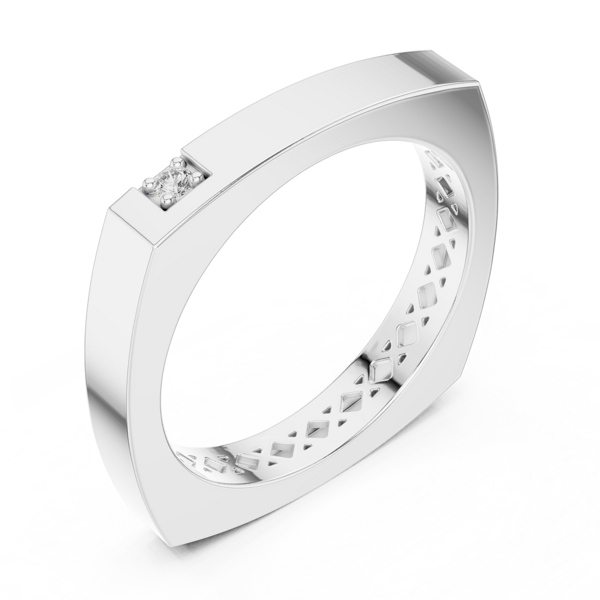 This refined band ring features a single round cut diamond set seamlessly into a bold square edge profile. The clean geometry and smooth surfaces create a strong, modern silhouette, while the precisely placed diamond adds subtle brilliance and visual depth without overpowering the design.
