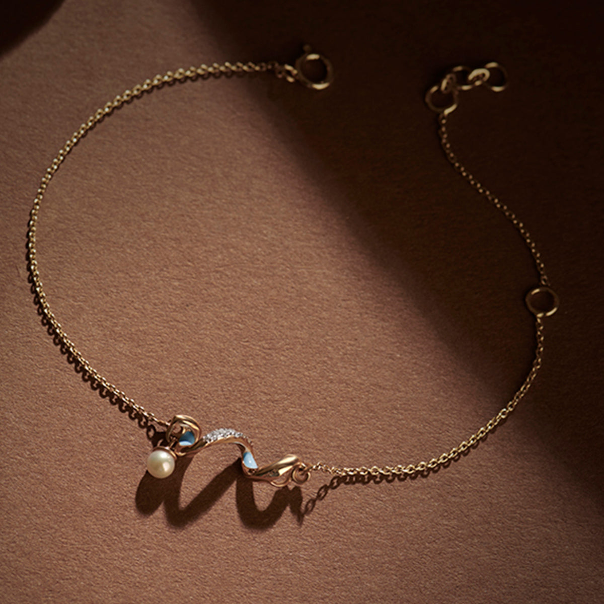 The Azure Twirl Pearl Bracelet in Yellow Gold is a captivating piece that combines the timeless elegance of pearls with the modern allure of a twirl design. This unique bracelet showcases a harmonious blend of classic and contemporary styles, making it a versatile accessory for various occasions. It's perfect for those seeking a piece that pairs the understated beauty of pearls with the dynamic appeal of modern design, offering a sophisticated touch to any ensemble.