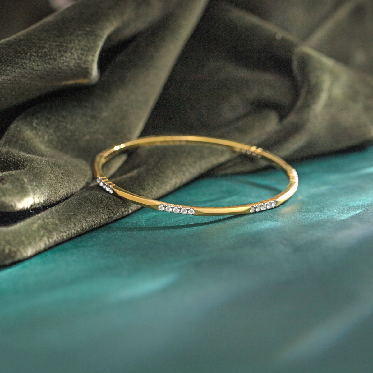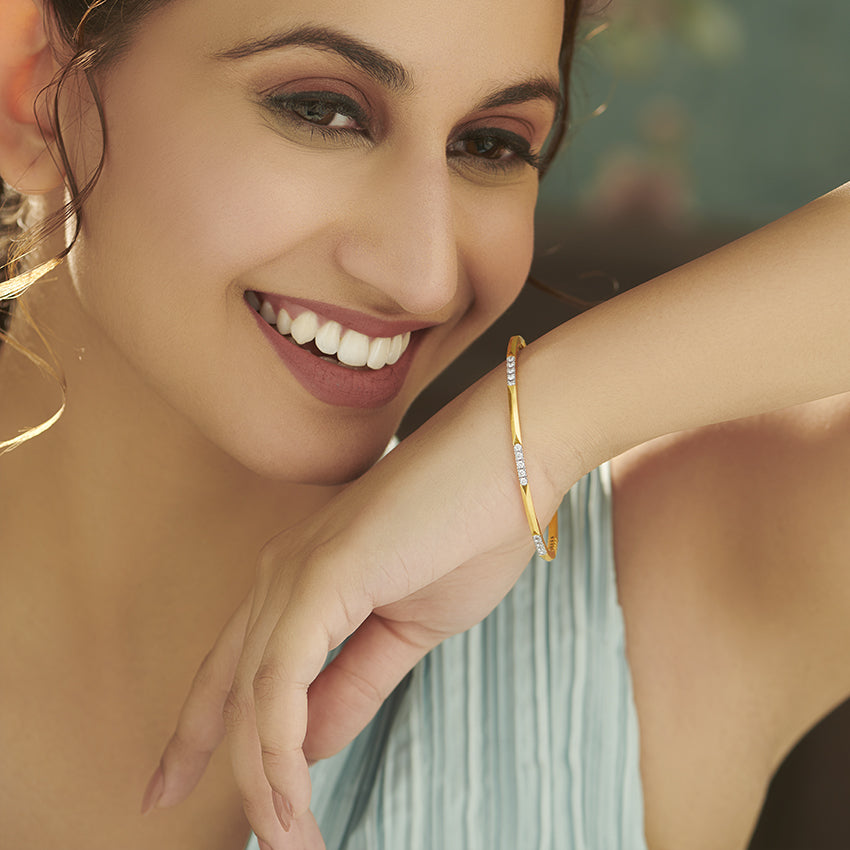 The Charisma Diamond Bangle by CzedJewels is a timeless piece of jewellery that exudes elegance and sophistication. The bangle is crafted in 18KT yellow gold and features an intricate design studded with diamonds. The diamonds are carefully chosen to add just the right amount of sparkle to the bangle, making it perfect for both daily wear and special occasions. The bangle is sleek and lightweight, making it easy to wear and comfortable on the wrist.
