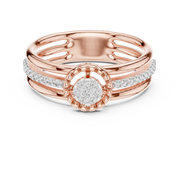 This elegant diamond ring features a round cut diamond cluster framed within a refined halo design, creating striking visual depth and symmetry. Accented by shimmering side stones along the band, the composition delivers balanced brilliance and a graceful flow of light. The structured silhouette and polished finish enhance its timeless appeal, making it a refined statement of modern luxury.