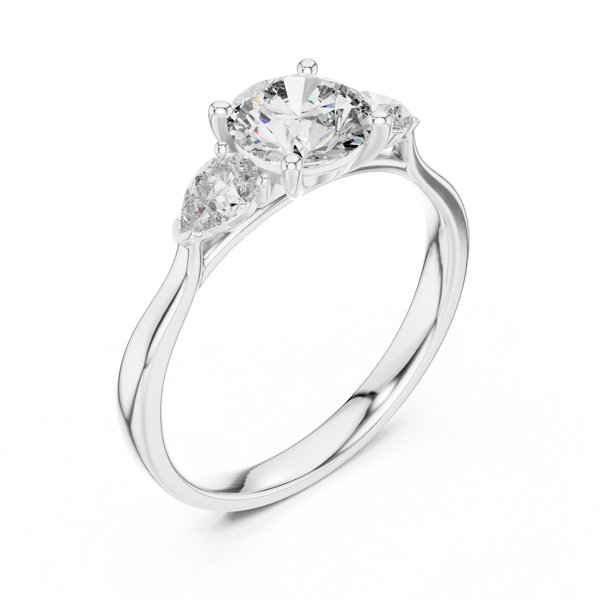 This elegant three stone ring showcases a brilliant round cut diamond at the center, gracefully framed by two pear-shaped side diamonds. The symmetrical arrangement creates visual balance while enhancing depth and sparkle. A refined prong setting allows light to enter from multiple angles, delivering exceptional brilliance and a timeless, sophisticated profile.