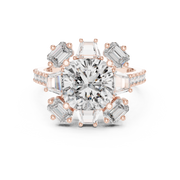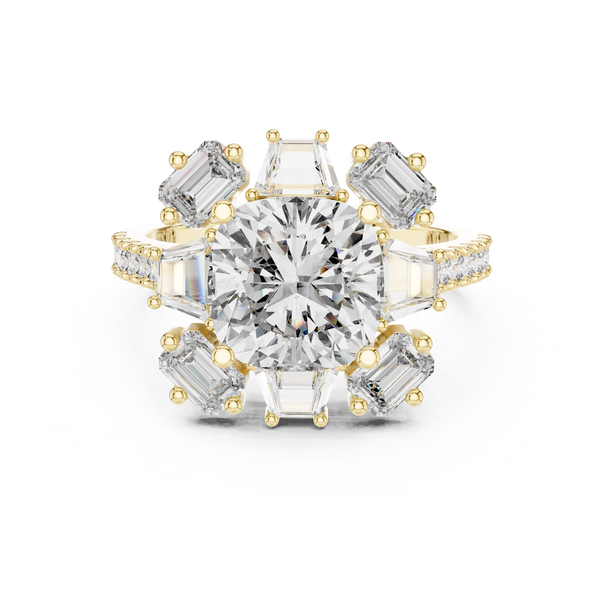 Cushion Cut Diamond Halo Ring with Emerald and Baguette Accents
