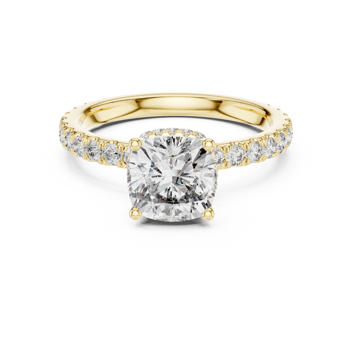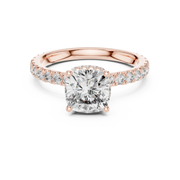 This refined engagement ring showcases a cushion cut diamond at its center, secured in a classic prong setting that allows maximum light to pass through for exceptional brilliance. The design is beautifully balanced with a slender band lined with shimmering round diamonds, creating a graceful silhouette and continuous sparkle from every angle. Its clean symmetry and elegant proportions give the ring remarkable depth, fire, and timeless sophistication.