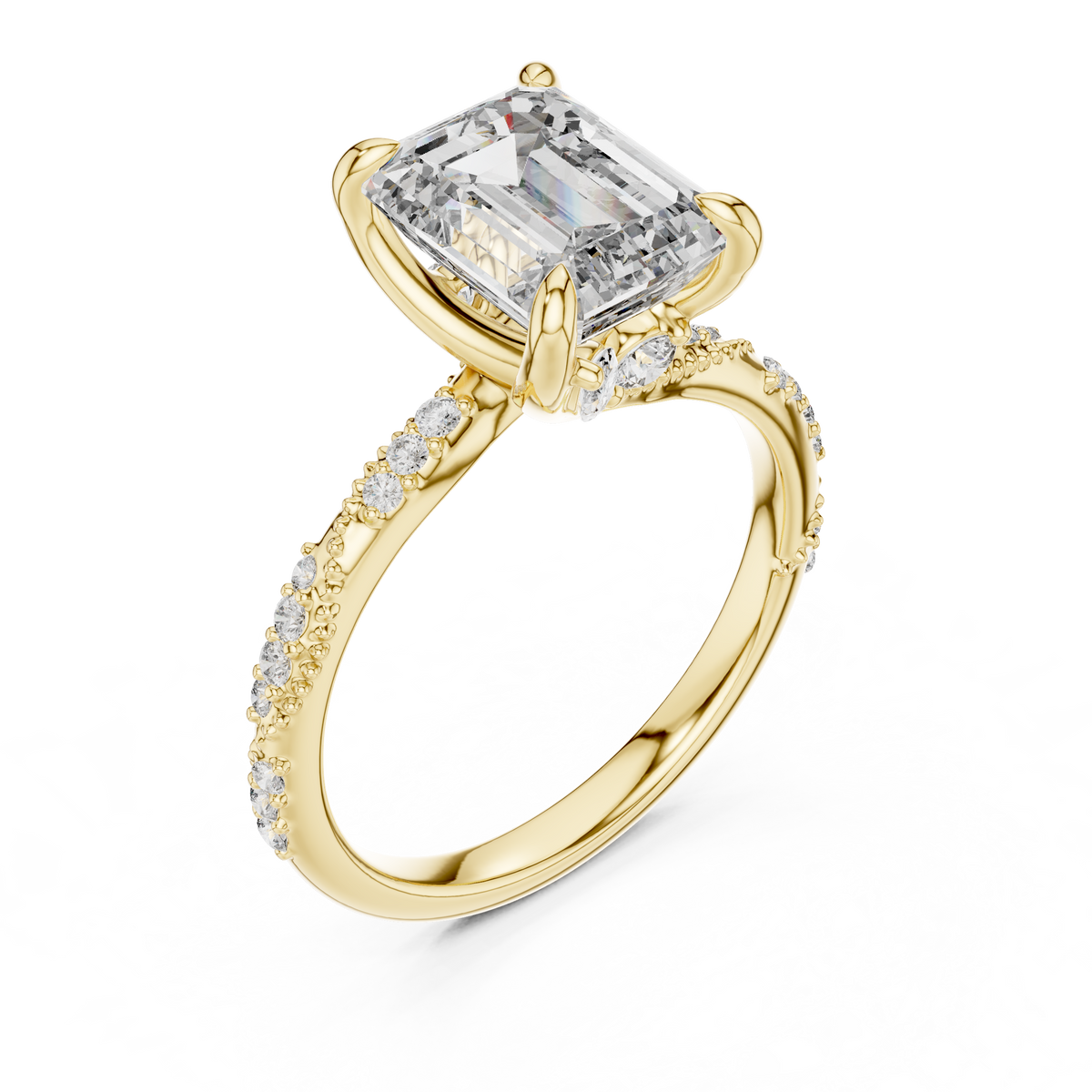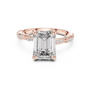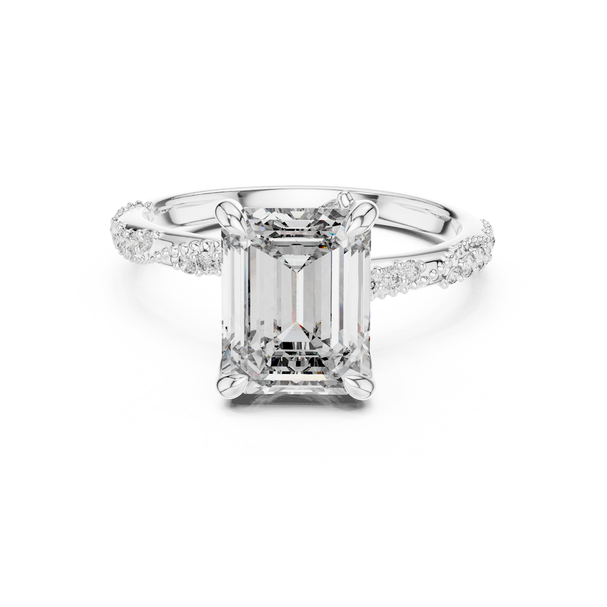 This elegant engagement ring showcases a striking emerald cut diamond as the centerpiece, celebrated for its clean step facets and mirror-like brilliance. Secured in a refined prong setting, the elongated silhouette creates graceful symmetry and impressive visual depth. The band is accented with shimmering pavé-set diamonds that enhance light reflection from every angle, delivering a timeless and luxurious presence on the hand.