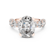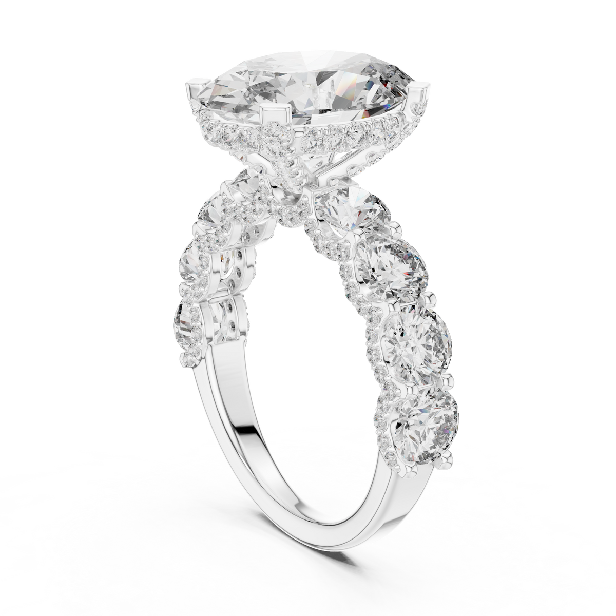 This elegant ring showcases a striking oval cut diamond at the center, complemented by a refined arrangement of round cut side stones. The balanced silhouette and structured prong setting enhance symmetry while allowing exceptional light play. The design delivers depth, brilliance, and a timeless presence on the finger.