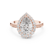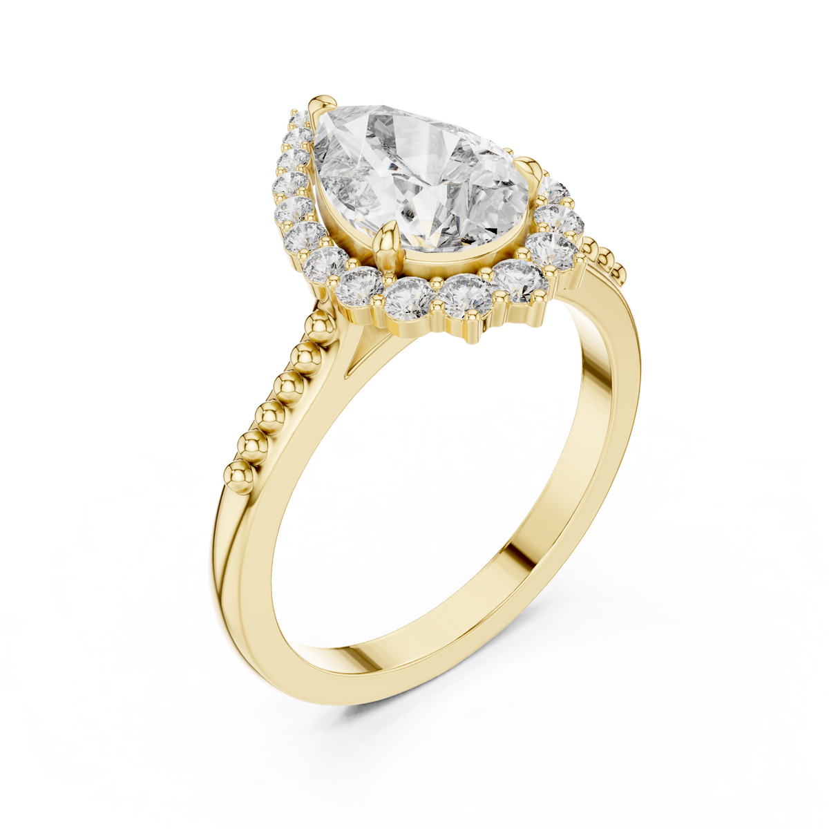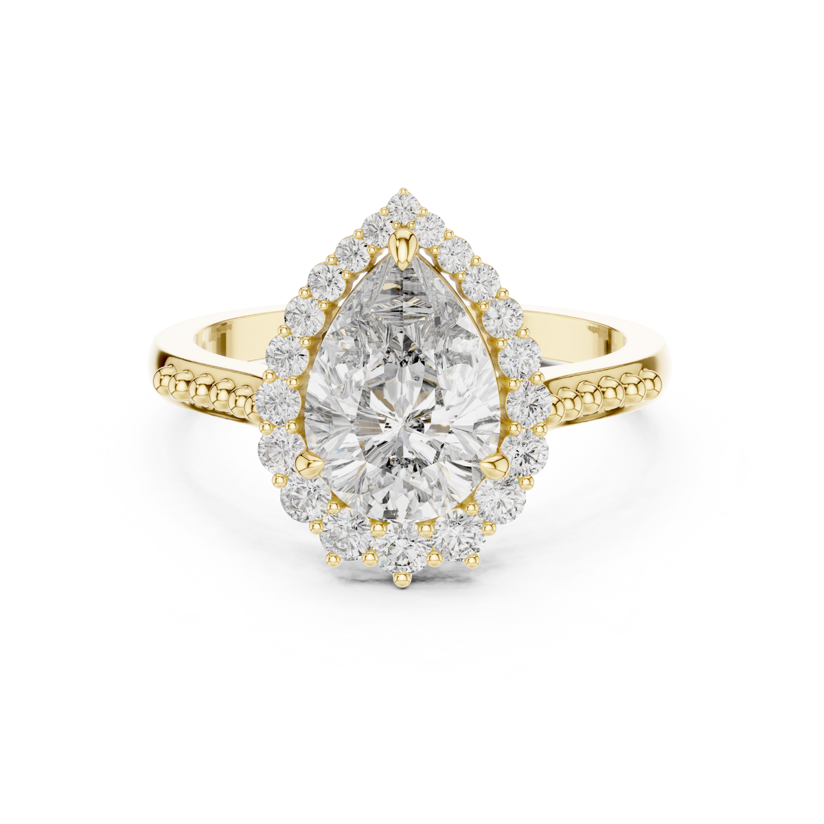 This exquisite ring showcases a striking pear cut gemstone at its center, gracefully framed by a halo of round brilliant diamonds. The elongated silhouette creates elegant symmetry, while the delicately beaded band adds refined texture and visual depth. Designed to maximize brilliance, the halo setting enhances the center stone’s sparkle from every angle.