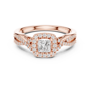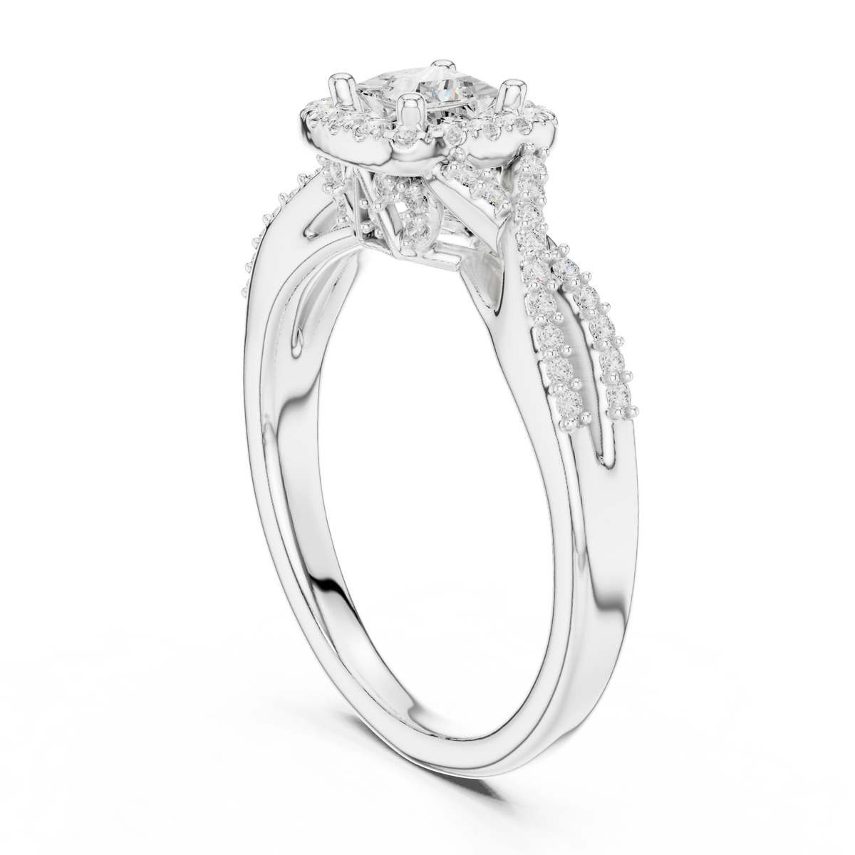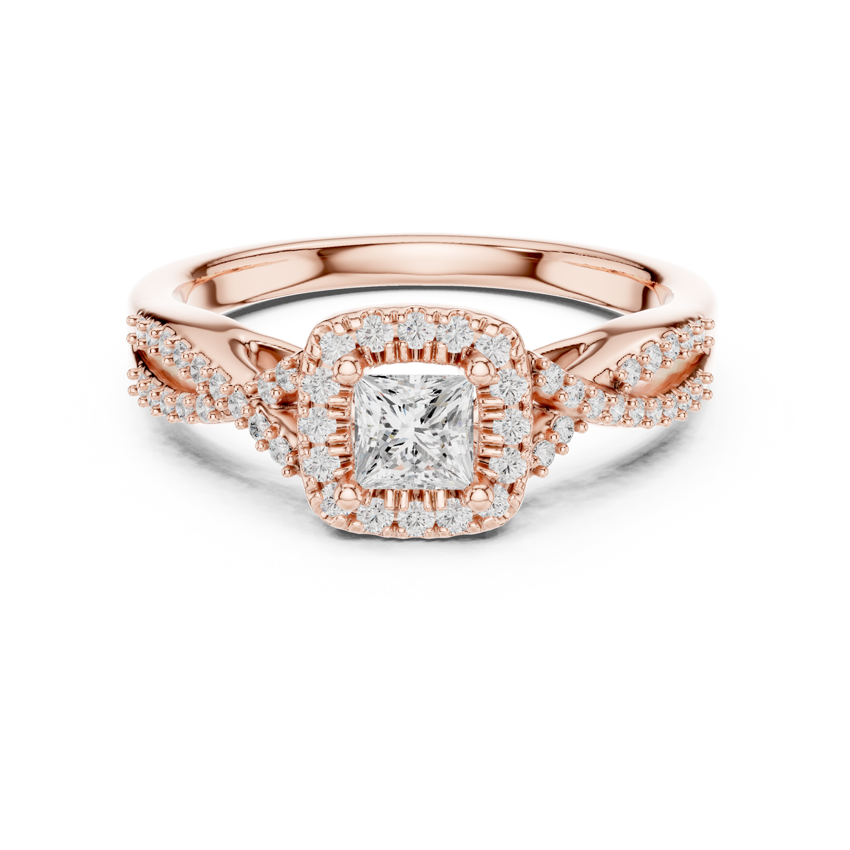 This elegant engagement ring showcases a striking princess cut diamond center framed by a luminous halo of round brilliant diamonds. The square silhouette is perfectly balanced with a graceful split shank band, accented with shimmering pavé stones that create continuous sparkle from every angle. The refined symmetry and layered diamond detailing enhance depth, brilliance, and light performance, resulting in a timeless yet modern statement piece.