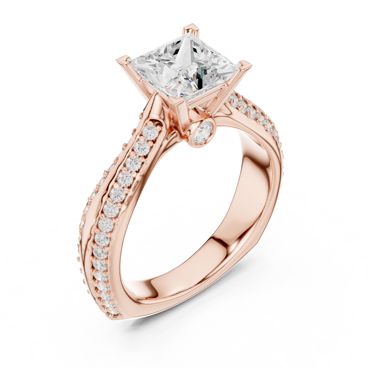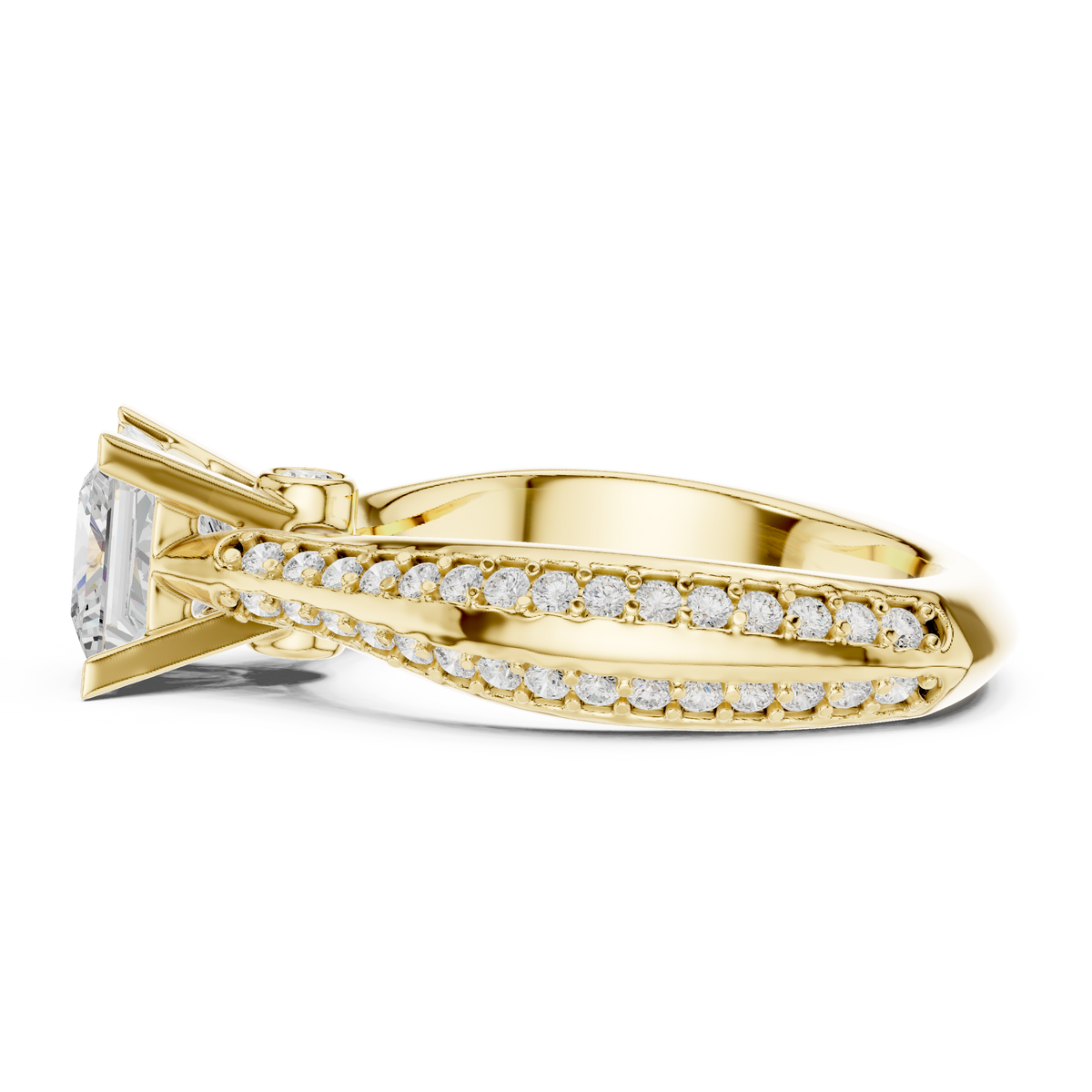 This exquisite engagement ring showcases a striking princess cut diamond at its center, defined by its sharp corners and exceptional brilliance. The center stone is secured in a refined prong setting, allowing maximum light reflection for captivating sparkle. A gracefully sculpted split shank design enhances the ring’s symmetry, while pavé-set side diamonds add layered brilliance and visual depth. The balanced proportions and clean lines create a timeless yet contemporary silhouette that radiates elegance from every angle.