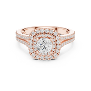 This refined engagement ring showcases a brilliant round cut diamond at its center, framed by a luminous double halo of precisely set round diamonds. The cushion-inspired halo silhouette enhances the visual size and sparkle of the center stone, while a graceful split shank band lined with pavé diamonds creates elegant symmetry. Every angle reveals depth, brilliance, and a balanced architectural design that radiates timeless luxury.