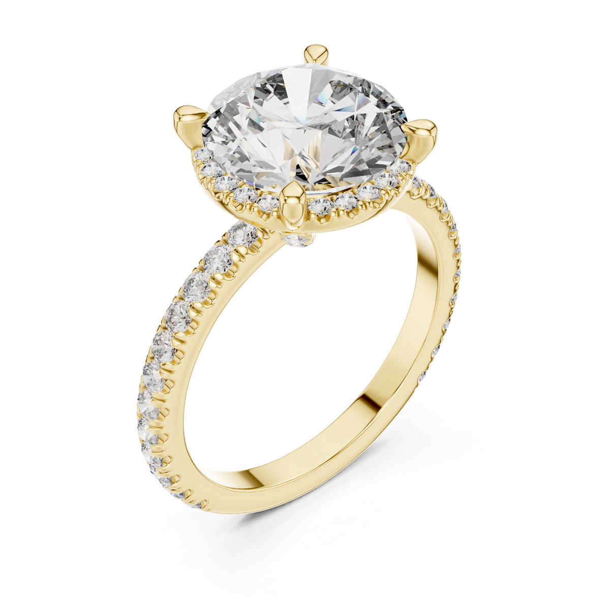 This exquisite engagement ring showcases a breathtaking round brilliant cut diamond at its center, surrounded by a delicate halo of round diamonds that enhance its size and radiance. The symmetrical design flows seamlessly into a pavé-set diamond band, creating continuous sparkle from every angle. The refined prong setting secures the center stone while allowing maximum light reflection, delivering remarkable brilliance and visual depth.