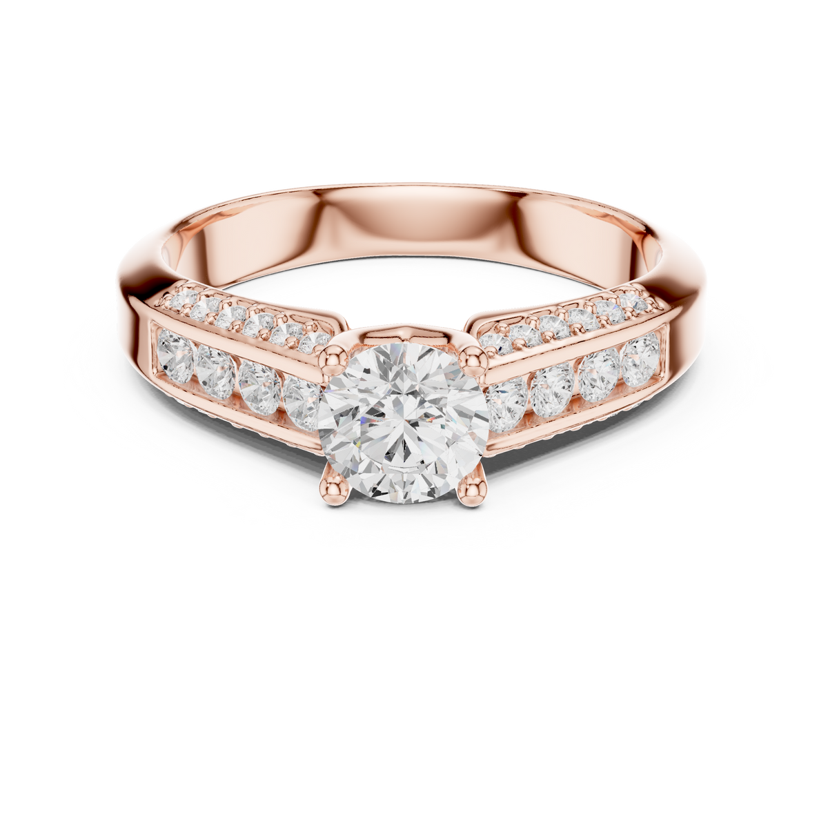 - Center stone: Round brilliant diamond secured in prong/collet setting