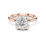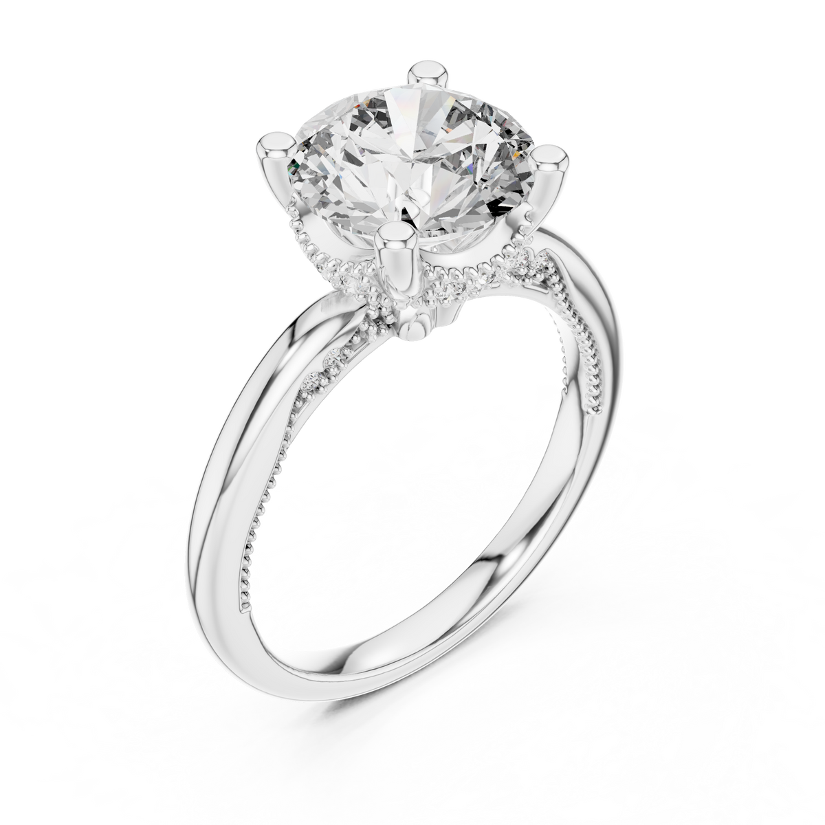 This refined engagement ring showcases a striking round brilliant cut diamond as the focal point, elevated in a classic four-prong setting. The clean solitaire silhouette is enhanced by delicate pavé diamonds subtly set along the shoulders, creating soft sparkle from every angle. Its symmetrical profile, open gallery, and balanced proportions maximize light performance, delivering exceptional brilliance, depth, and fire while maintaining a timeless and elegant aesthetic.