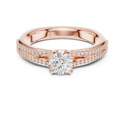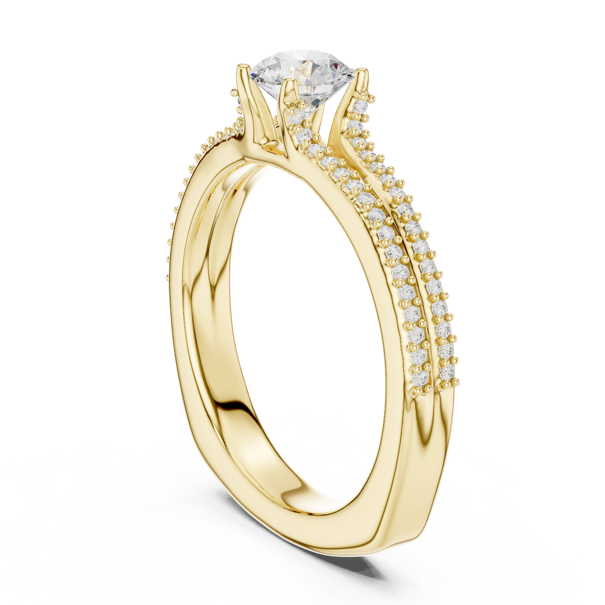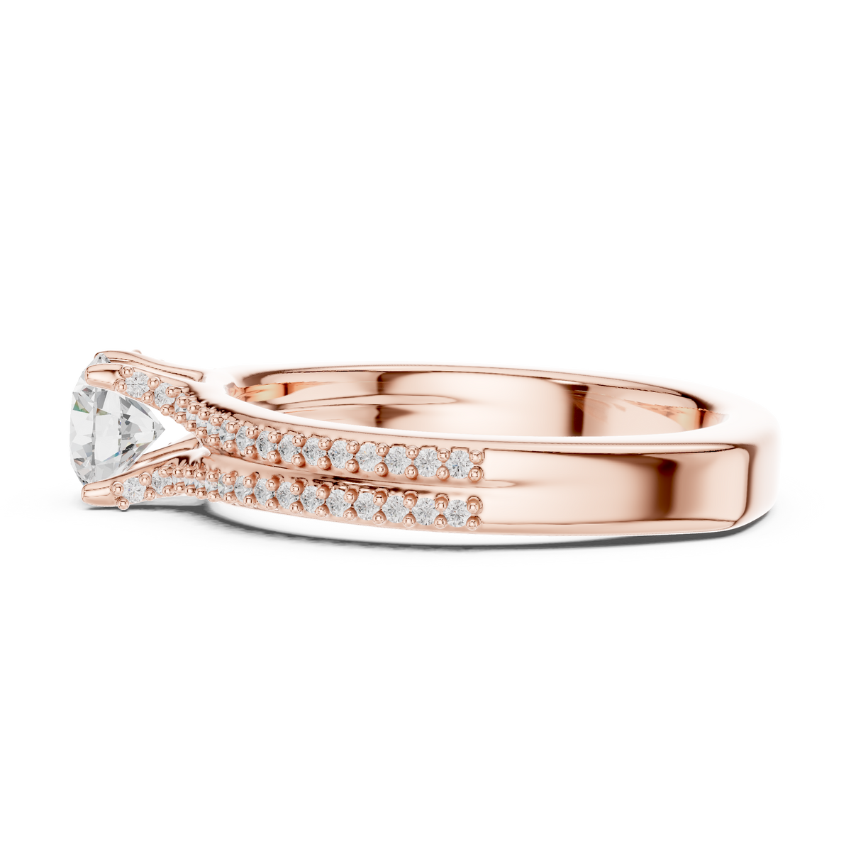 This elegant engagement ring features a brilliant round cut diamond held securely in a classic prong setting, elevated above a graceful split shank band. The shoulders divide delicately and are lined with pavé-set diamonds, creating layered sparkle and visual depth from every angle. Its balanced proportions and clean symmetry give the ring a timeless, sophisticated presence suited for everyday elegance and special occasions alike.