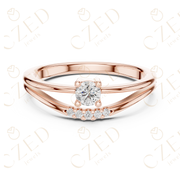 This refined diamond ring features a classic round brilliant solitaire as its focal point, elevated by a graceful split band that meets seamlessly beneath the center stone. A row of graduated round diamonds is set along the front of the band, adding subtle brilliance and visual depth. The balanced proportions and clean symmetry create an elegant silhouette that highlights light performance from every angle.