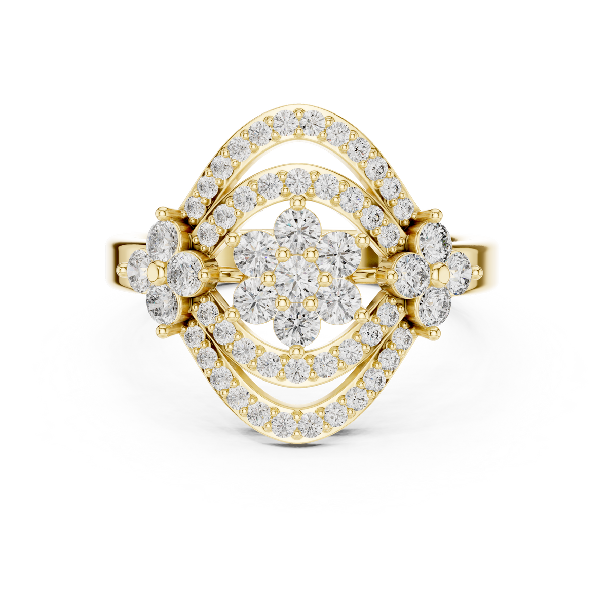 - Side stone details: Round cut diamonds arranged in layered halo frames