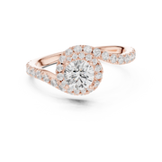 This refined engagement ring showcases a brilliant round cut diamond at the center, embraced by a radiant halo of smaller diamonds that amplify light and presence. The design flows into a graceful split shank band lined with pavé stones, creating balanced symmetry, depth, and continuous sparkle from every angle. The silhouette feels elegant yet modern, offering exceptional brilliance and a luxurious visual profile.