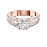 This striking ring features a brilliant round cut diamond as its centerpiece, elevated in a classic prong setting to maximize light performance. The band is richly detailed with structured rows of baguette diamonds framed by delicate pavé set round diamonds, creating a layered and symmetrical design. The clean geometry of the baguette stones contrasts beautifully with the sparkle of the round accents, enhancing visual depth and brilliance. The result is a bold yet refined silhouette that radiates timeless luxury.