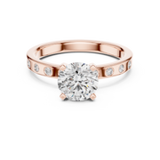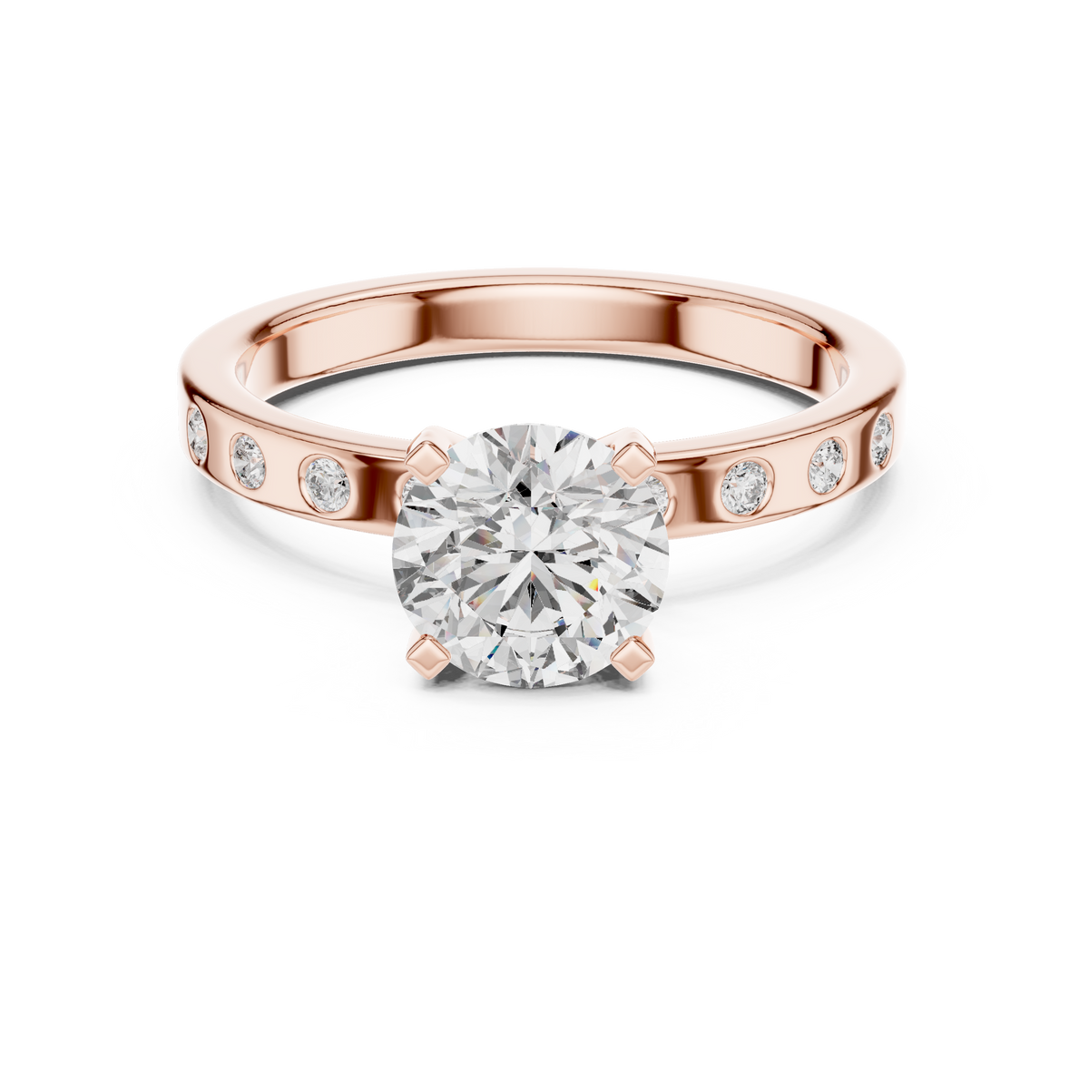 This elegant ring showcases a brilliant round cut diamond as its captivating center stone, secured in a classic prong setting that allows maximum light reflection. The design is beautifully balanced with bezel set round diamonds embedded along the band, creating a refined and symmetrical silhouette. The clean lines of the band enhance the visual depth of the center stone, while the subtle side diamonds add extra brilliance without overpowering the solitaire focal point. The overall composition delivers timeless sparkle with a modern, minimal aesthetic.