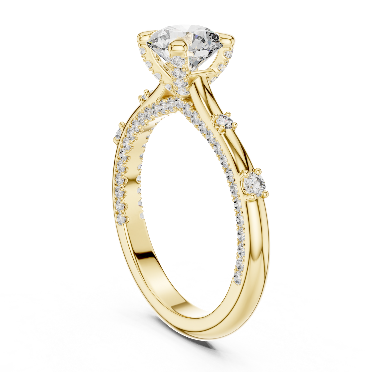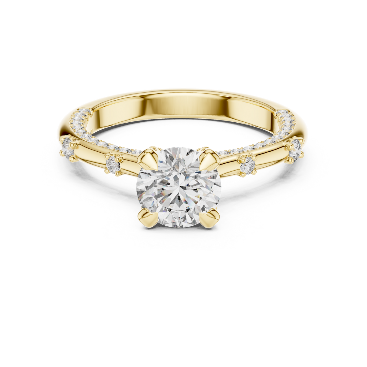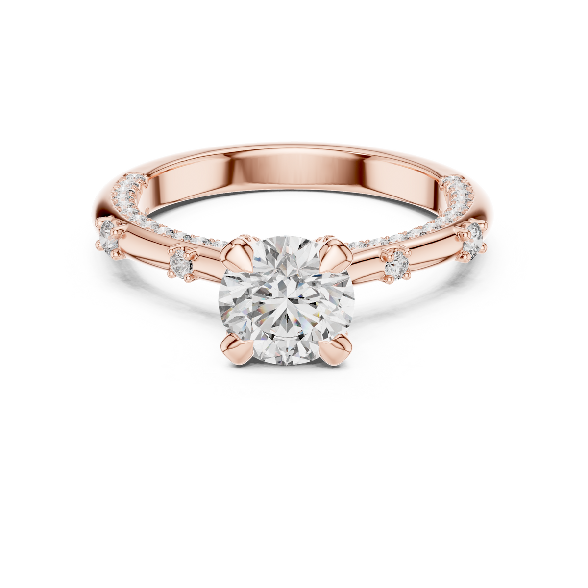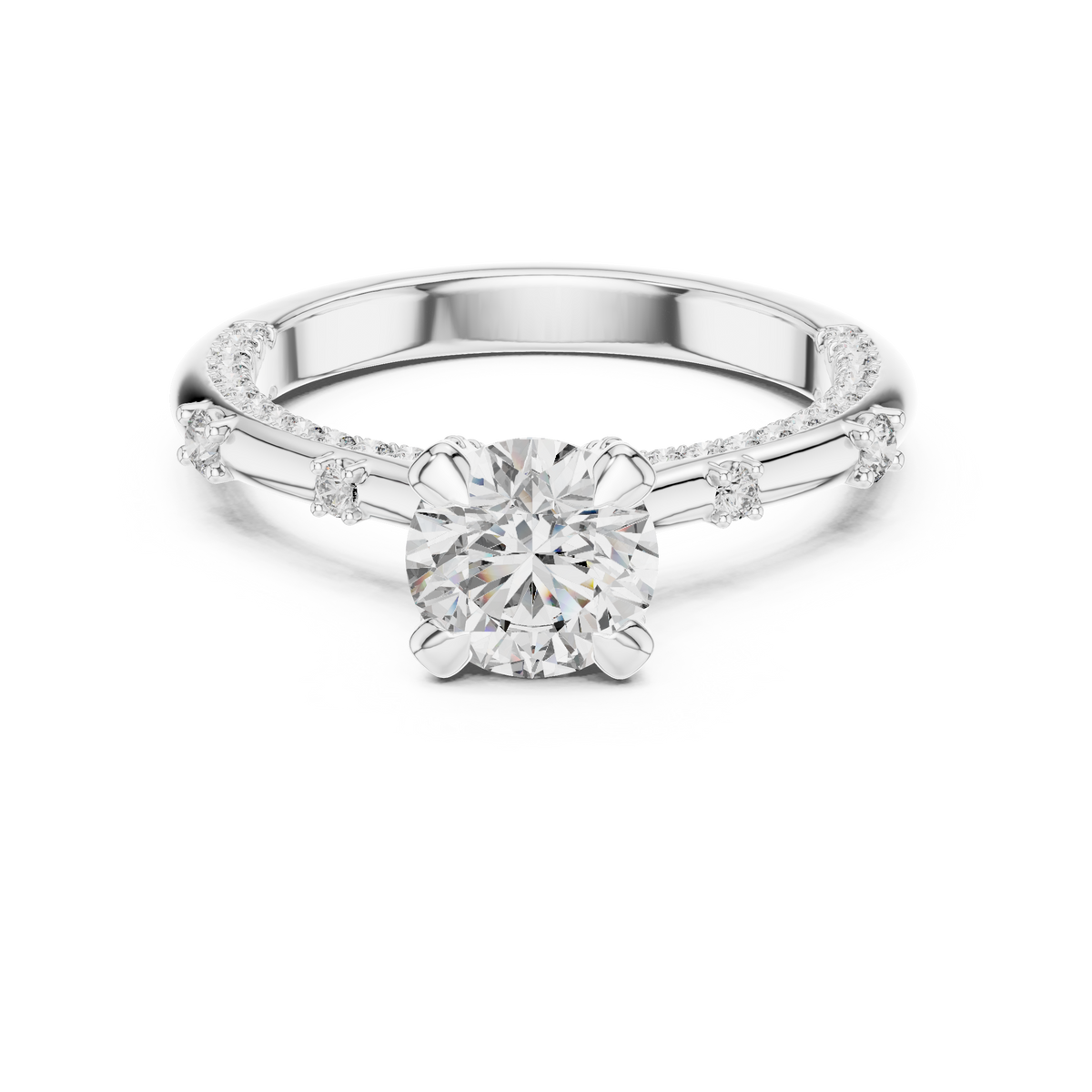 - Side stones: Round cut diamonds pavé-set along the band