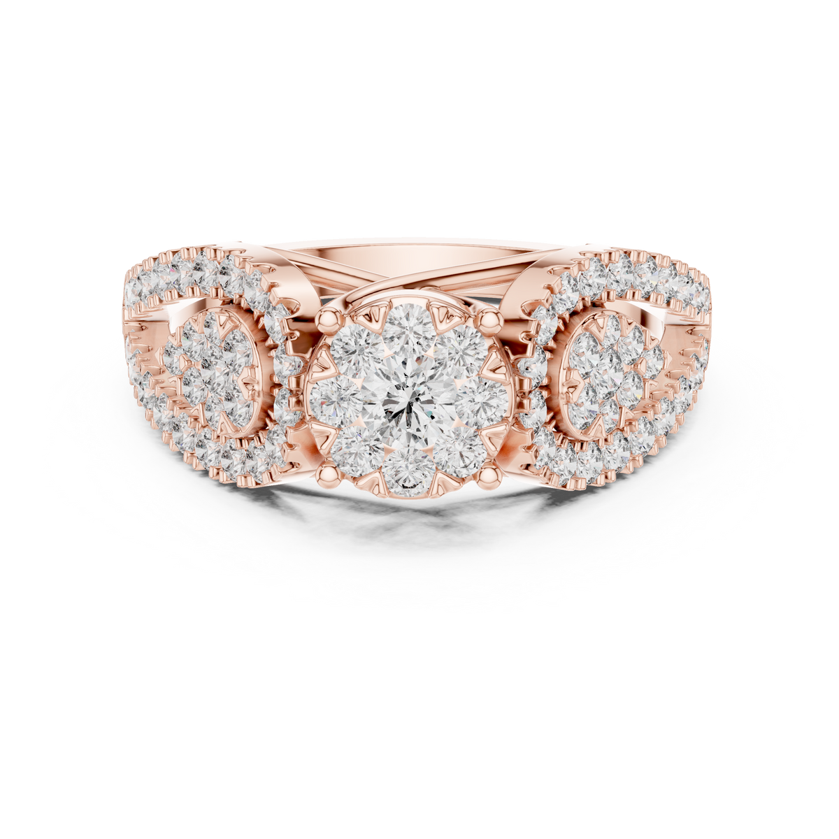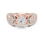 Round Cut Diamond Three Stone Halo Ring with Split Shank