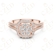 This elegant diamond ring features a striking round cluster center framed by a radiant halo of finely set round diamonds. The symmetrical design is enhanced by detailed side stones along the shoulders, creating exceptional depth, brilliance, and a refined vintage-inspired presence.