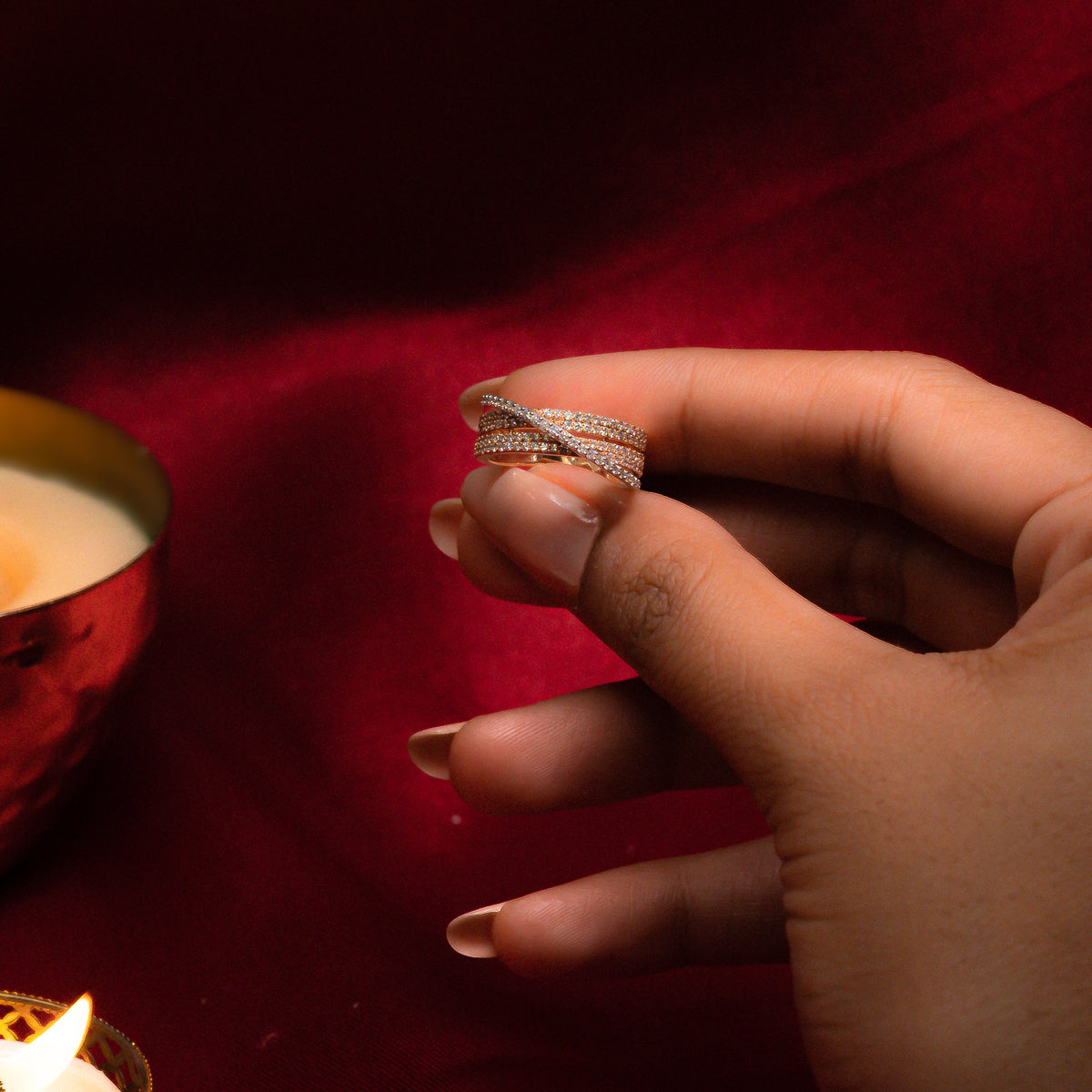 The Trio Overlap Diamond Band is a breathtaking blend of luxury and modern design. This stunning ring features three rows of sparkling diamonds, artfully intertwined with a contrasting band of diamonds that elegantly overlaps. Crafted in exquisite gold, the intricate design and shimmering diamonds create a dazzling visual effect. Perfect for any special occasion, the Trio Overlap Diamond Band is a timeless piece that adds sophistication and brilliance to your jewellery collection.