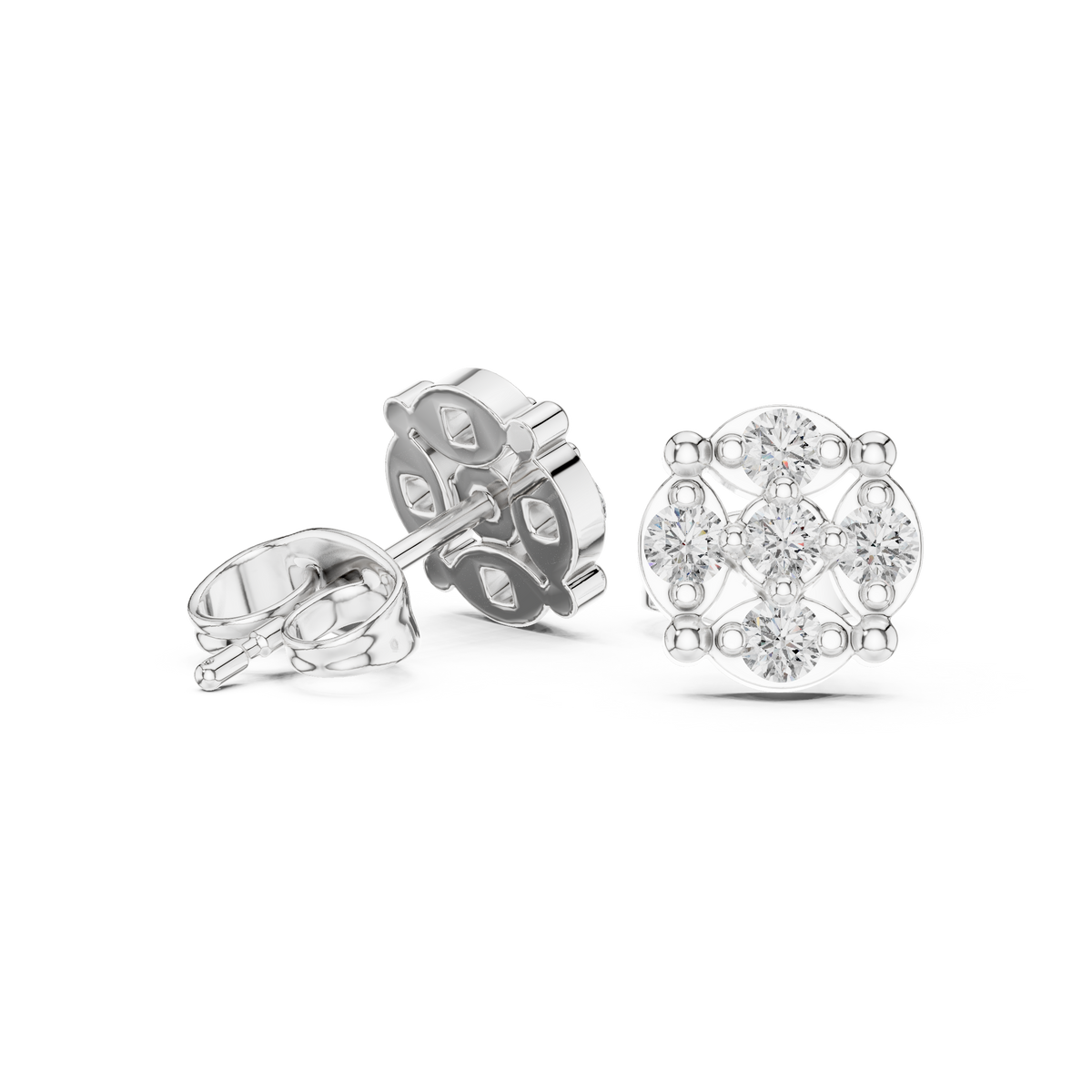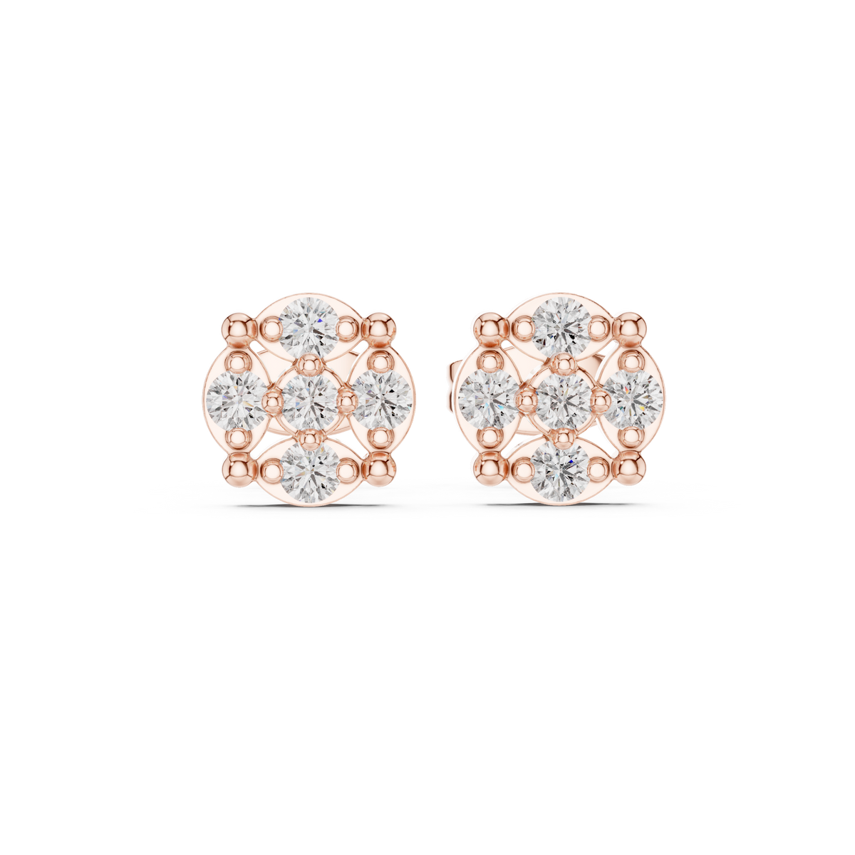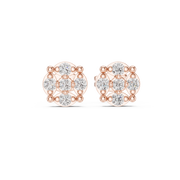 These elegant stud earrings showcase a refined floral-inspired cluster silhouette, crafted with precisely arranged round cut diamonds that form a symmetrical halo design. Each earring presents a balanced circular profile with open detailing that enhances light flow, creating exceptional brilliance and depth. The compact stud form offers a timeless look with radiant sparkle, perfect for both everyday sophistication and special occasions.