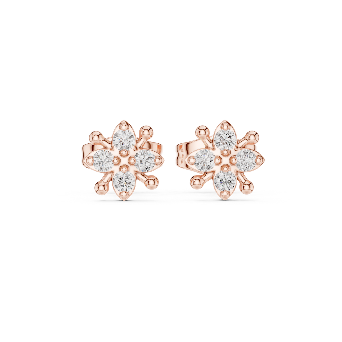 These diamond stud earrings showcase a delicate floral star cluster silhouette, crafted with brilliant round cut diamonds arranged in a symmetrical bloom formation. Each earring forms a refined star-like motif with balanced spacing and clean edges, offering beautiful depth, light reflection, and a polished finish. The compact stud design sits comfortably on the ear, delivering timeless elegance with radiant sparkle.