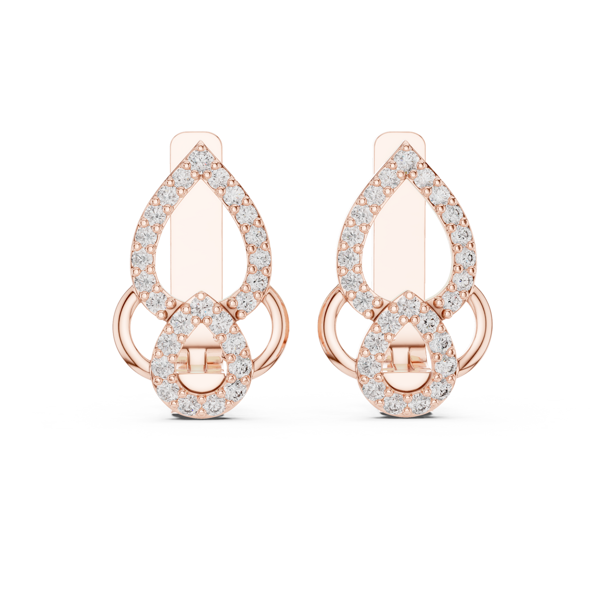 These diamond stud earrings feature an elegant teardrop link silhouette that blends soft curves with refined structure. A larger pear-inspired outline is accented by a smaller circular link below, both traced with round brilliant diamonds that create continuous sparkle. The openwork design adds depth and lightness, while the balanced symmetry delivers a polished and sophisticated look perfect for both everyday wear and special occasions.