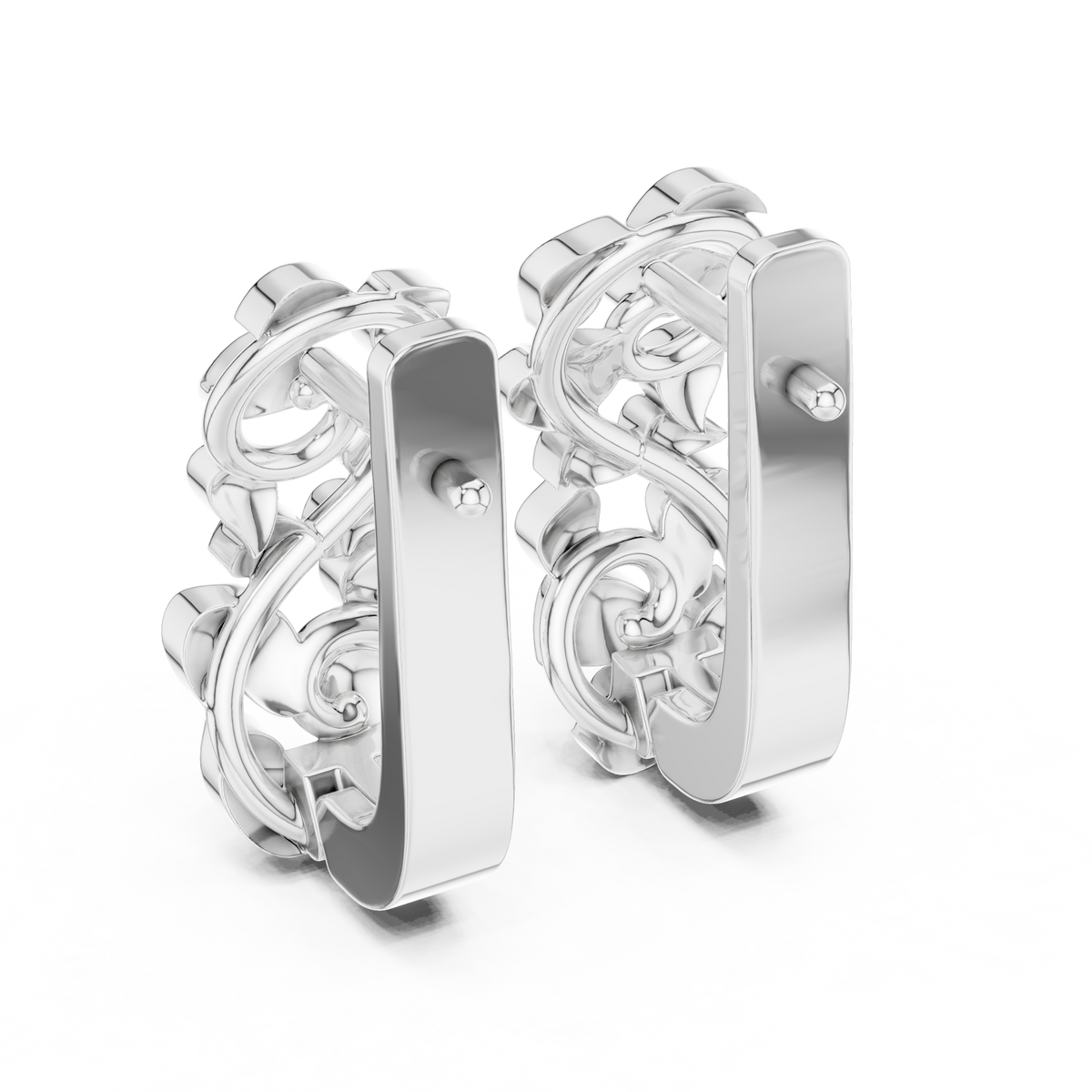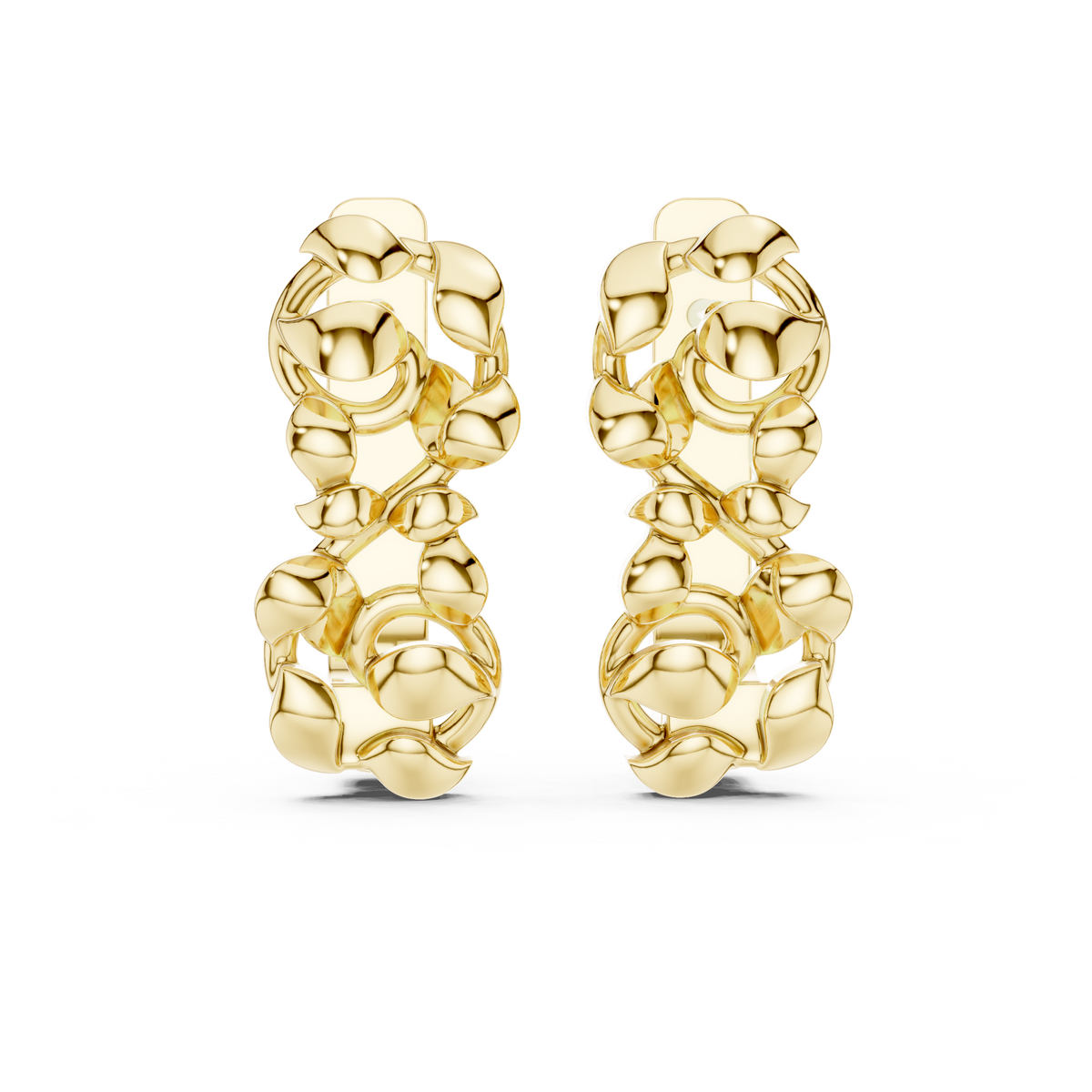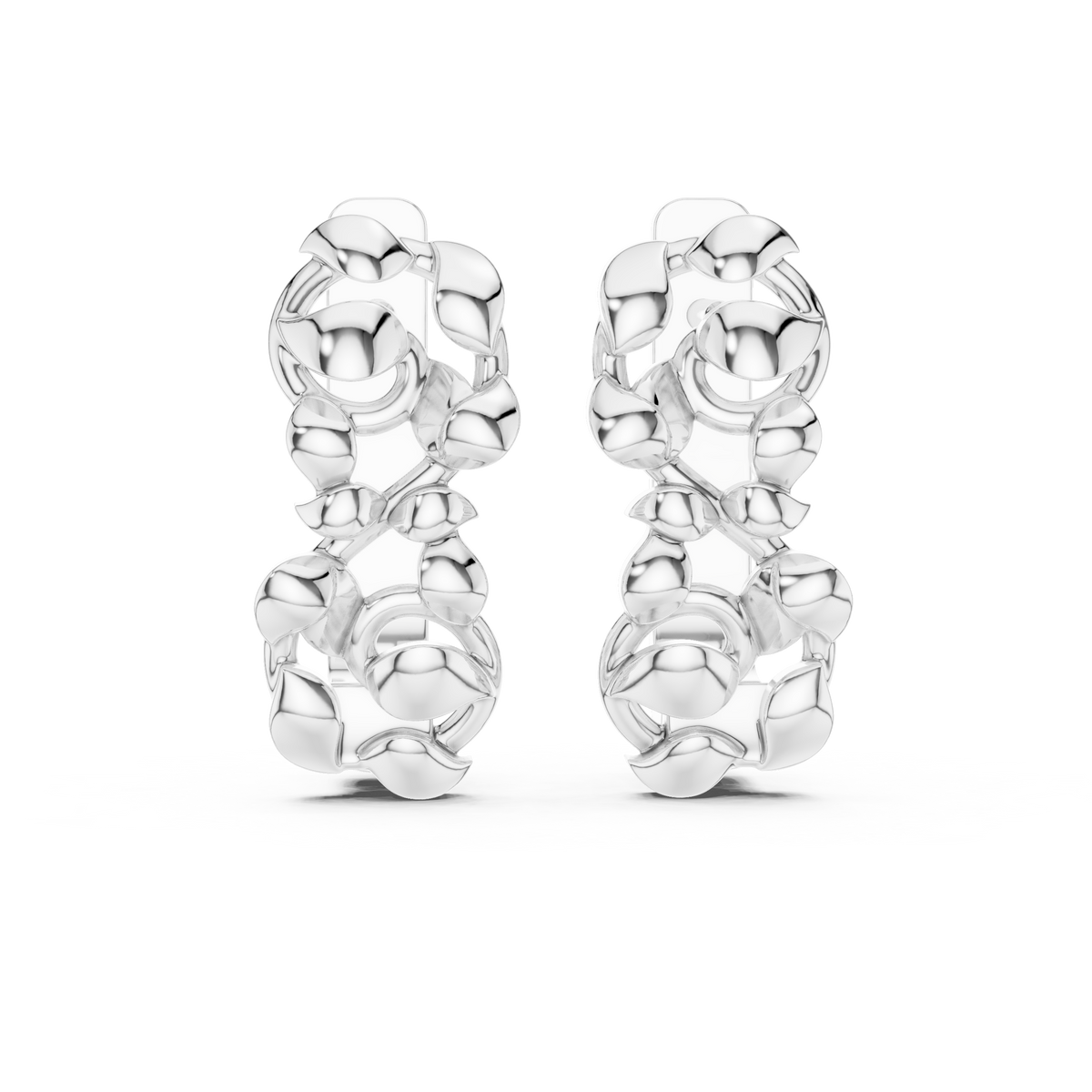 These sculpted stud earrings showcase a bold, organic link cluster design with smooth, high-polish surfaces that reflect light beautifully. The flowing, rounded forms interlock to create a dimensional silhouette with depth and modern character. Designed with clean symmetry and a compact profile, the earrings offer a contemporary statement while remaining refined and wearable for everyday styling.