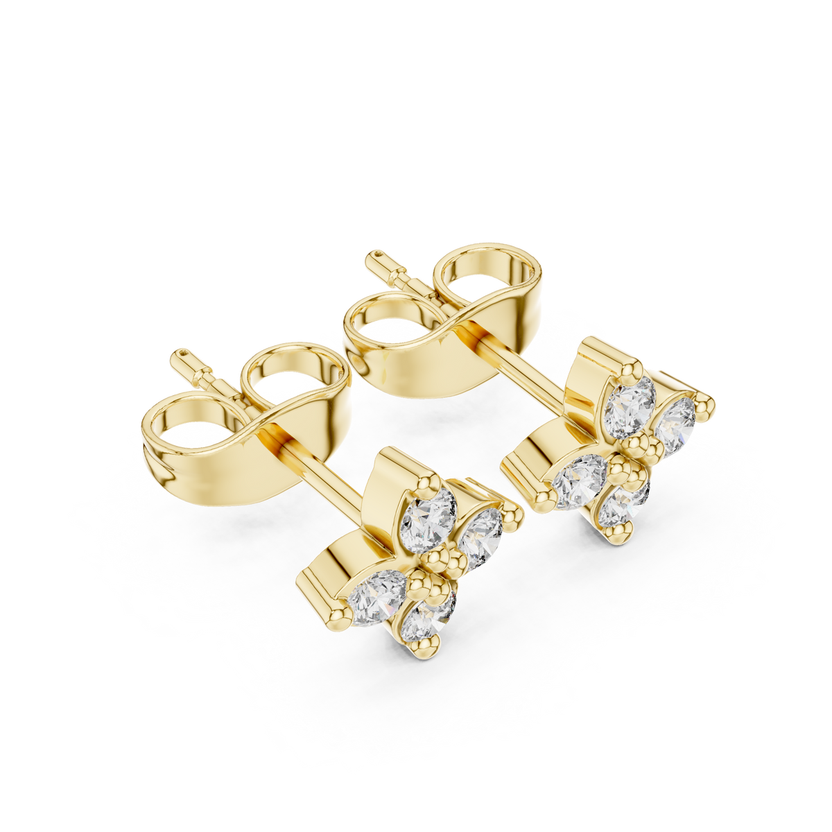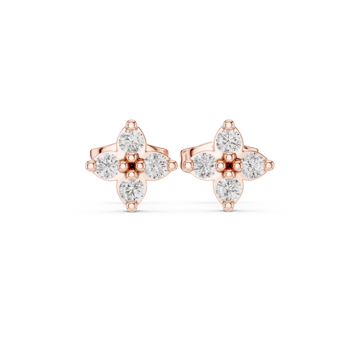 These elegant stud earrings showcase a refined floral cluster silhouette crafted with round brilliant diamonds arranged in a symmetrical four-petal motif. Each stone is carefully prong set to maximize light exposure, creating exceptional brilliance and depth from every angle. The compact stud profile sits comfortably on the ear, offering a polished, radiant look that feels both timeless and modern.