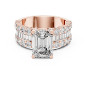 Emerald Cut Diamond Three Stone Ring with Double Row Band