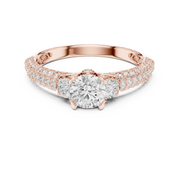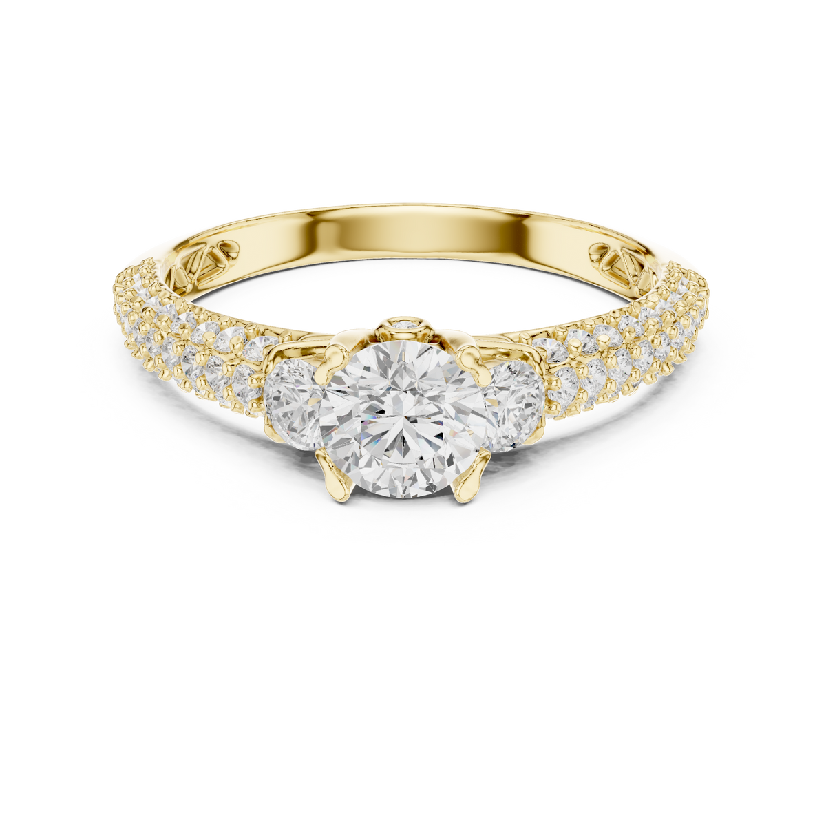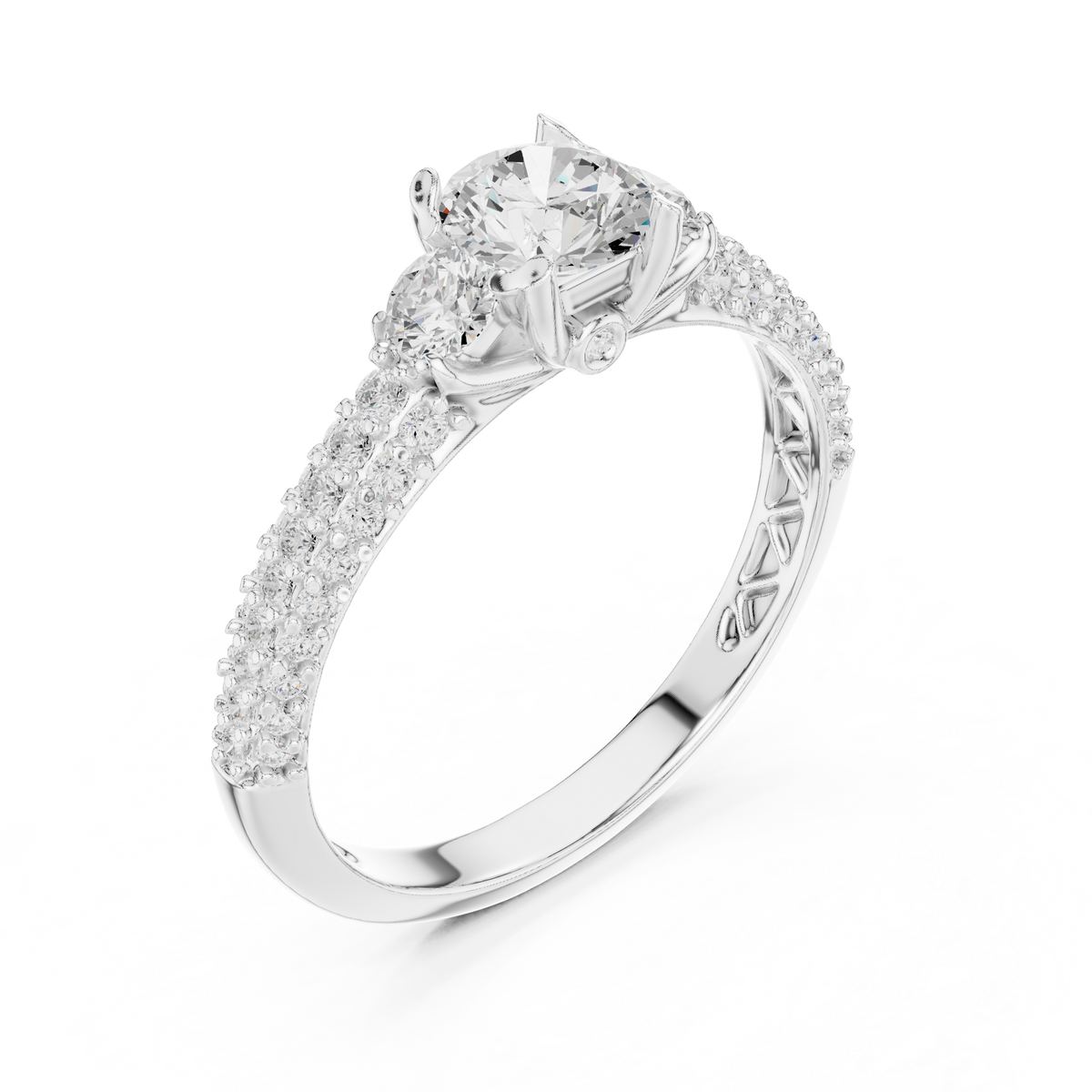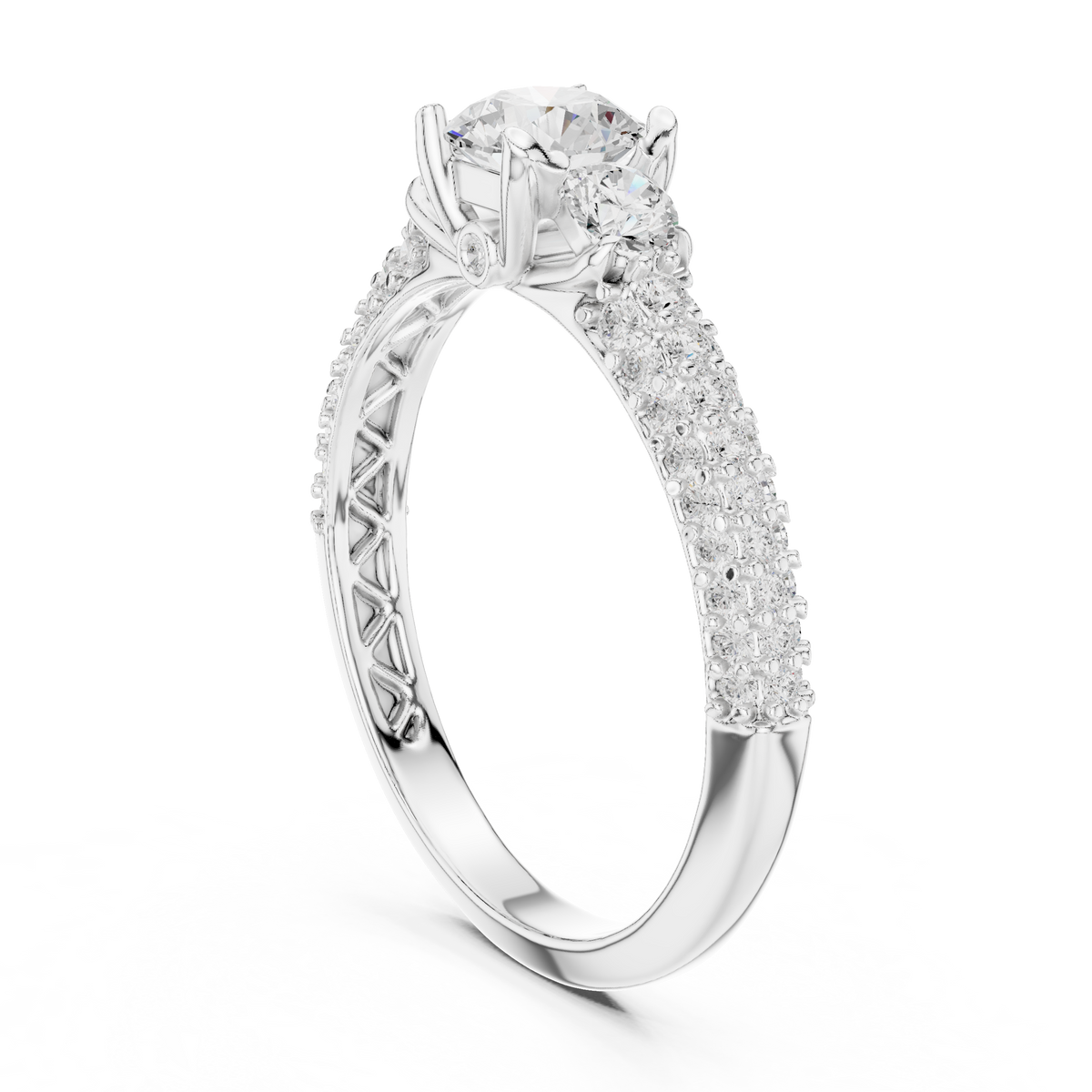 This refined engagement ring showcases a round brilliant cut diamond at the center, gracefully flanked by two round side stones. The elegant three-stone composition is enhanced by a delicately pavé-set band, creating continuous sparkle from every angle. The symmetrical design offers visual depth, brilliance, and balanced proportions, making it a timeless symbol of love and commitment.