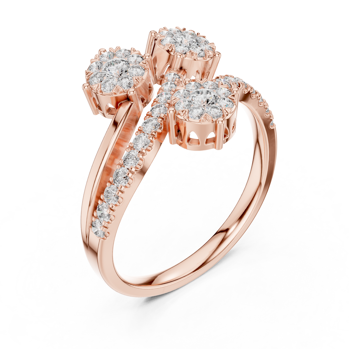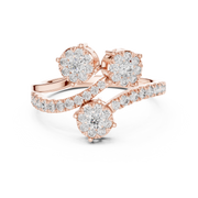 This elegant diamond ring showcases a sculptural three stone design highlighted by round cut diamond floral clusters. Each cluster is carefully arranged to create soft symmetry, while the intersecting twist structure adds movement and dimensional depth. The combination of clustered brilliance and flowing lines delivers a refined, statement-forward aesthetic with exceptional sparkle.