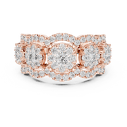 This elegant ring showcases a refined three stone composition highlighted by round cut diamonds arranged in a symmetrical halo band design. The balanced layout enhances visual depth while amplifying brilliance from every angle. Expert prong setting allows light to flow freely through each diamond, creating a radiant and luxurious presence on the hand.