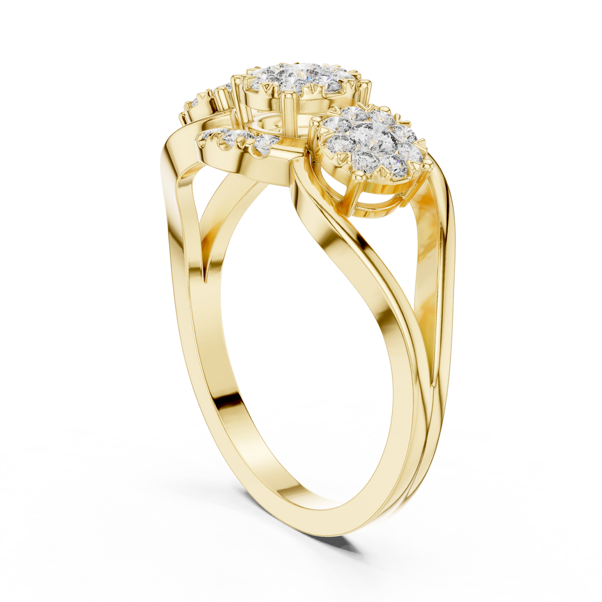 This elegant ring showcases a refined three stone composition, each formed by round cut diamonds arranged in luminous cluster halos. The center cluster is balanced by two matching side clusters, creating graceful symmetry and layered visual depth. Precisely set round diamonds enhance brilliance while maintaining a smooth, cohesive silhouette.