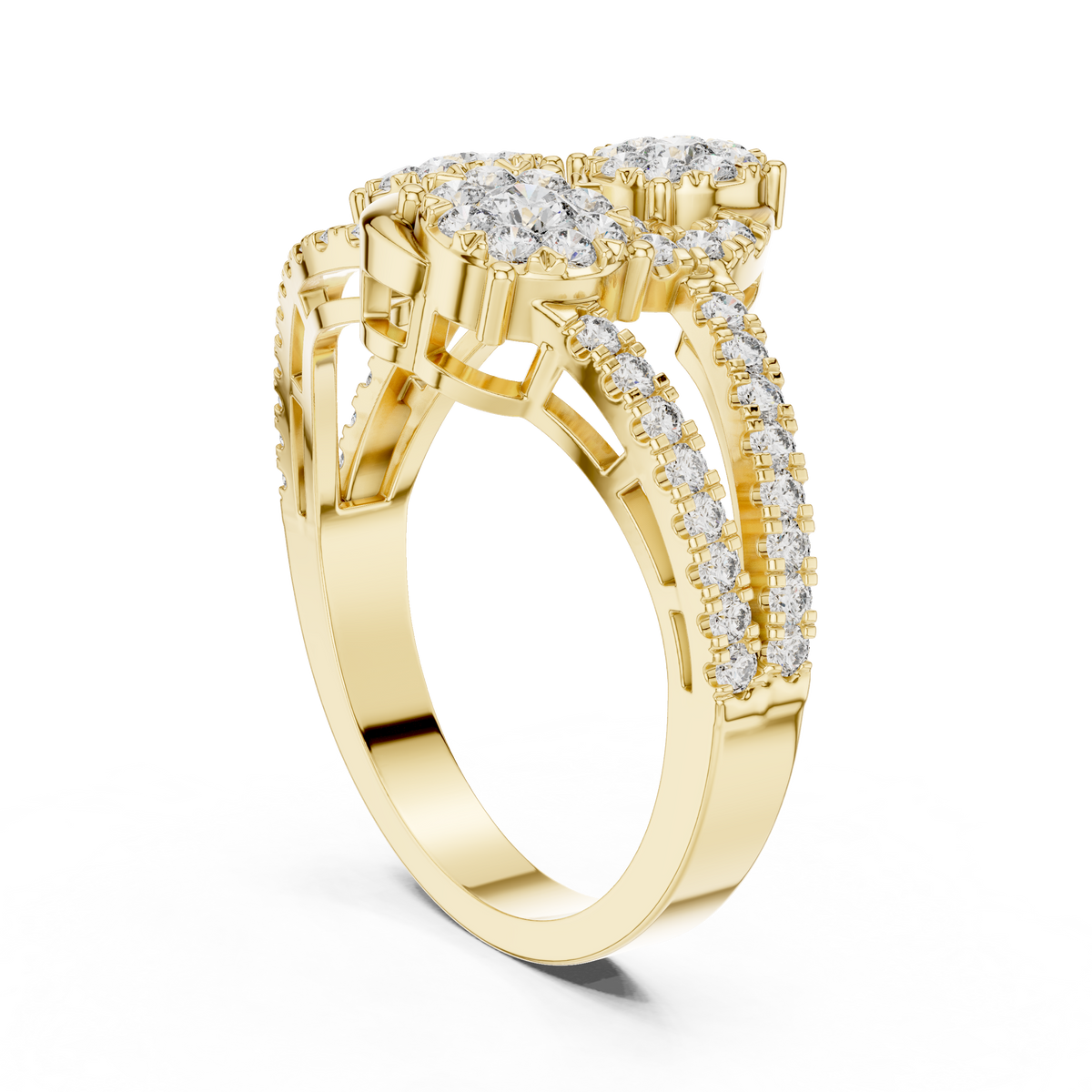 This elegant diamond ring showcases a striking three-stone composition, each formed by round cut diamonds arranged in radiant halo clusters. The design features graceful symmetry, enhanced by pavé-set diamonds along the band that add depth, dimension, and continuous brilliance. The overlapping placement of the trio creates a bold yet refined statement with exceptional sparkle from every angle.