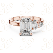 This sophisticated engagement ring showcases a striking emerald cut diamond at its center, celebrated for its clean lines and elegant step-cut facets. Flanked by two complementary side diamonds, the design creates perfect symmetry and visual balance. The refined three-stone setting enhances depth, clarity, and brilliance, resulting in a timeless and graceful silhouette.