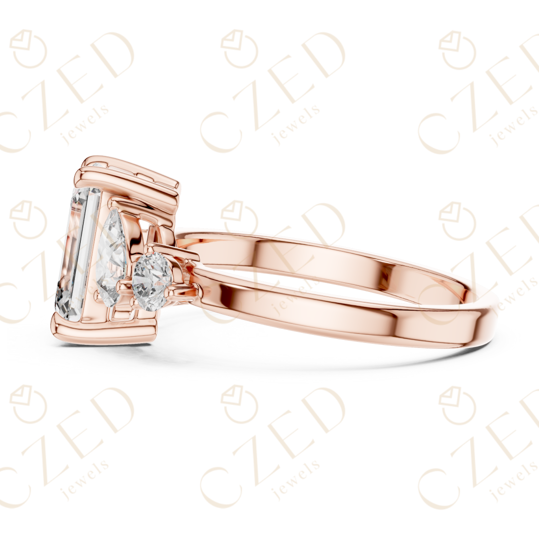 - Diamond shape & cut: Emerald cut center diamond with side diamonds