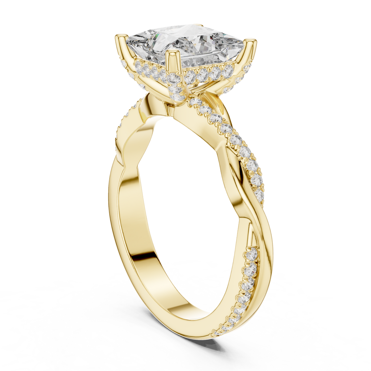 This elegant engagement ring showcases a striking princess cut diamond as the focal point, secured in a refined prong setting that maximizes light return and brilliance. The clean, geometric symmetry of the square center stone is beautifully balanced by a softly twisted pavé-set band, creating graceful movement and depth. The design blends modern structure with timeless sophistication, offering exceptional sparkle from every angle.